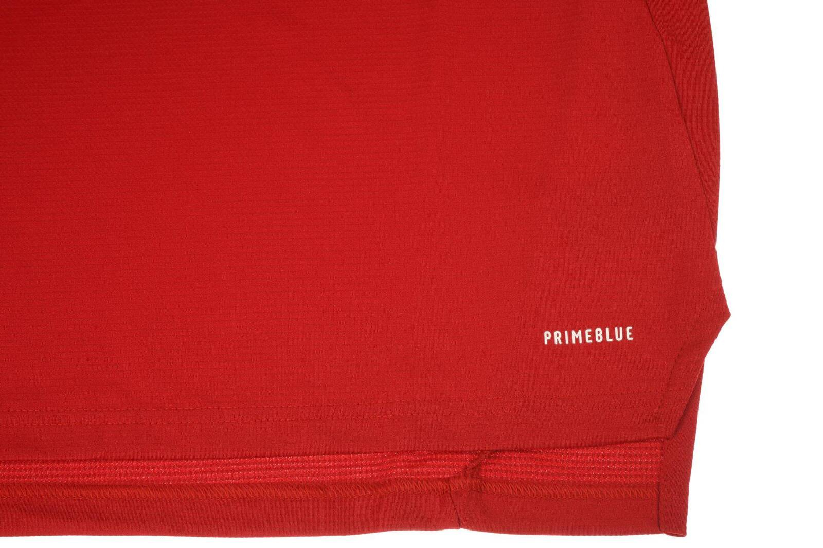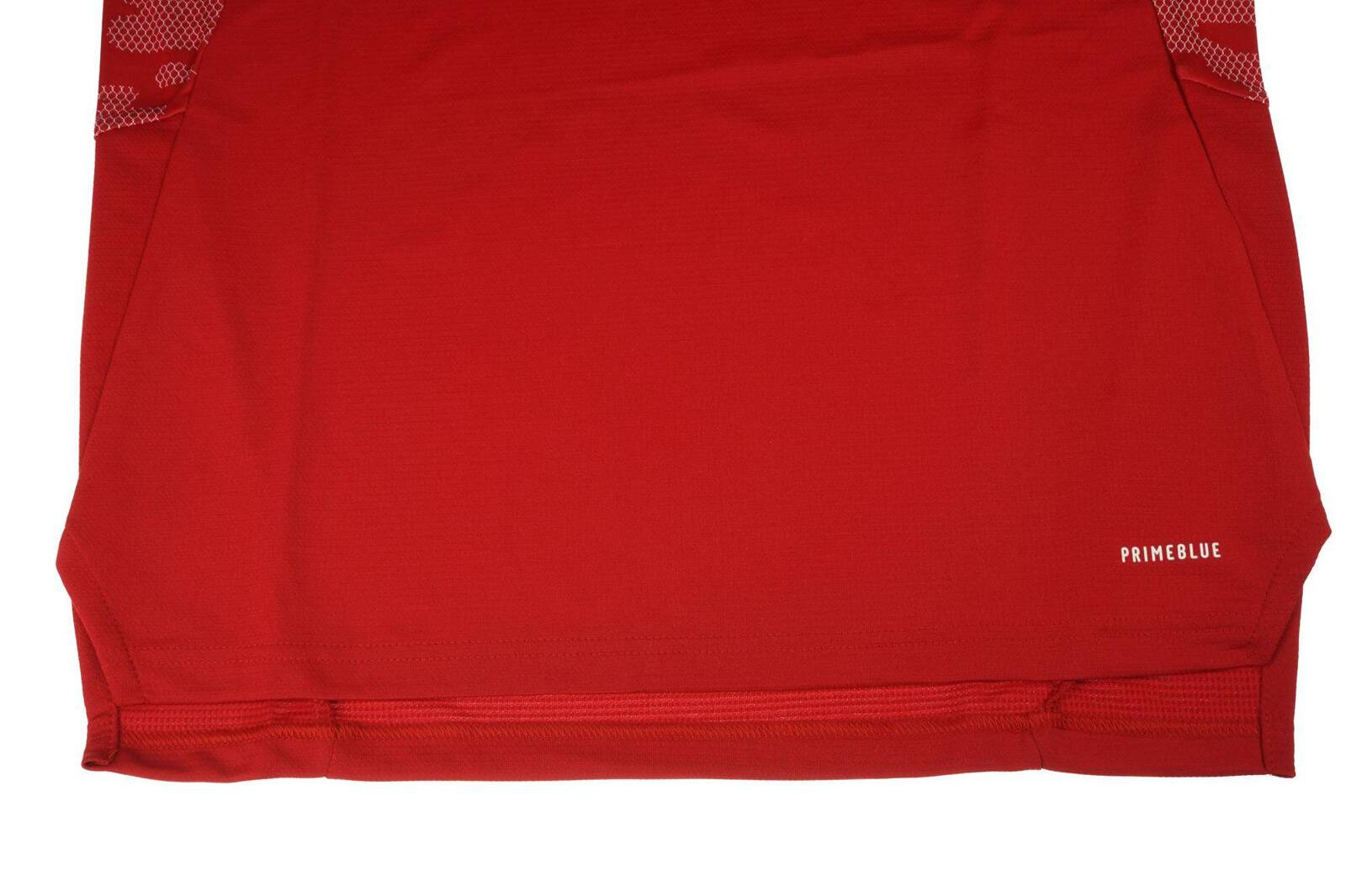 Męska bluza marki Adidas w kolorze czerwonym z serii Condivo 21 Training Top wykonane w 100% z poliestru pochodzącego z recyklingu. W tym modelu zastosowano technologię Aeroready, która sprawnie odprowadza wilgoć z powierzchni skóry na zewnątrz i zapewnia świetne właściwości wentylacyjne dla zachowania maksymalnego komfortu. Zamek umieszczony przy dekolcie usprawnia zakładanie oraz pozwala na dostosowanie temperatury. Jest on zabezpieczony tak aby zapobiec tworzeniu się podrażnień na skórze. Intensywna, czerwona kolorystyka oraz wstawki z printem na ramionach i pod pachami wyróżniają model ten na tle innych. Białe logo Adidas oraz charakterystyczne dla marki trzy paski dodają sportowego charakteru. Całość tworzy ciekawe, nietuzinkowe połączenie. Krój, który jest dopasowany podkreśla sylwetkę. Natomiast rozcięcia po bokach i wydłużony tył gwarantują swobodę ruchu i wysoki komfort użytkowania. Bluza sportowa męska jest idealnym wyborem na trening piłkarski, przejażdżkę rowerem, bieganie czy trening na siłowni. Sprawdzi się przy wykonywaniu wielu aktywności fizycznych. Wybierając ten model pomagasz dbać o środowisko, gdyż materiały użyte do jego stworzenia pochodzą z recyklingu. Primeblue jest tworzony z odpadów zbieranych z obszarów przy ocenach. Produkt jest nowy i posiada oryginalne metki.