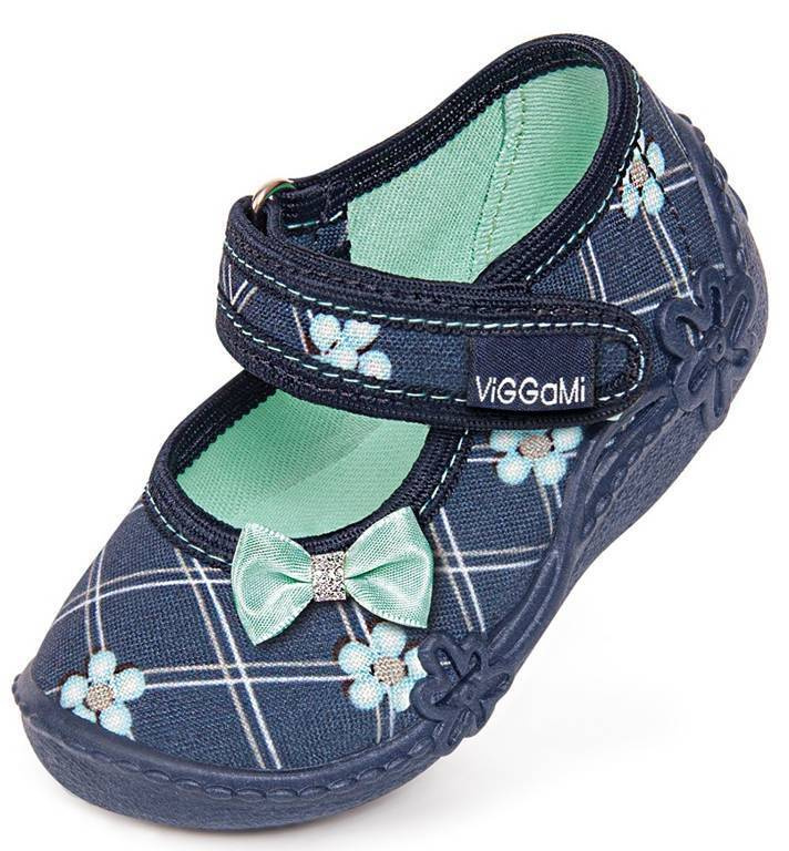 - Tenisówki dziecięce Viggami w granatowym kolorze z ciekawym wzorkiem i kokardką. Kapcie są zapinanie na rzep co znacznie ułatwia samodzielne zakładanie obuwia przez dziecko. Posiadają certyfikat zdrowej stopy.