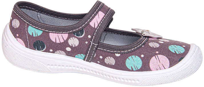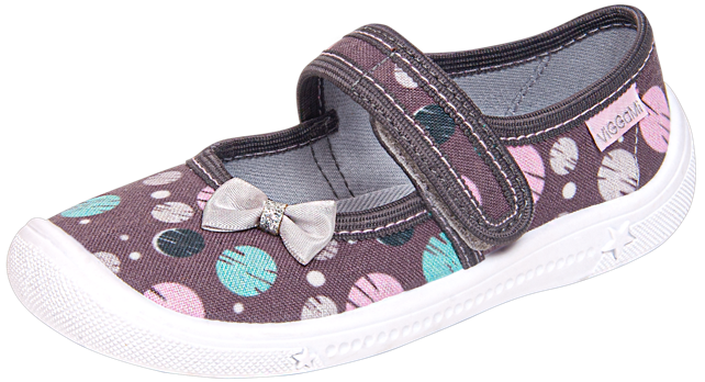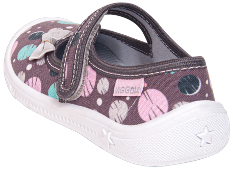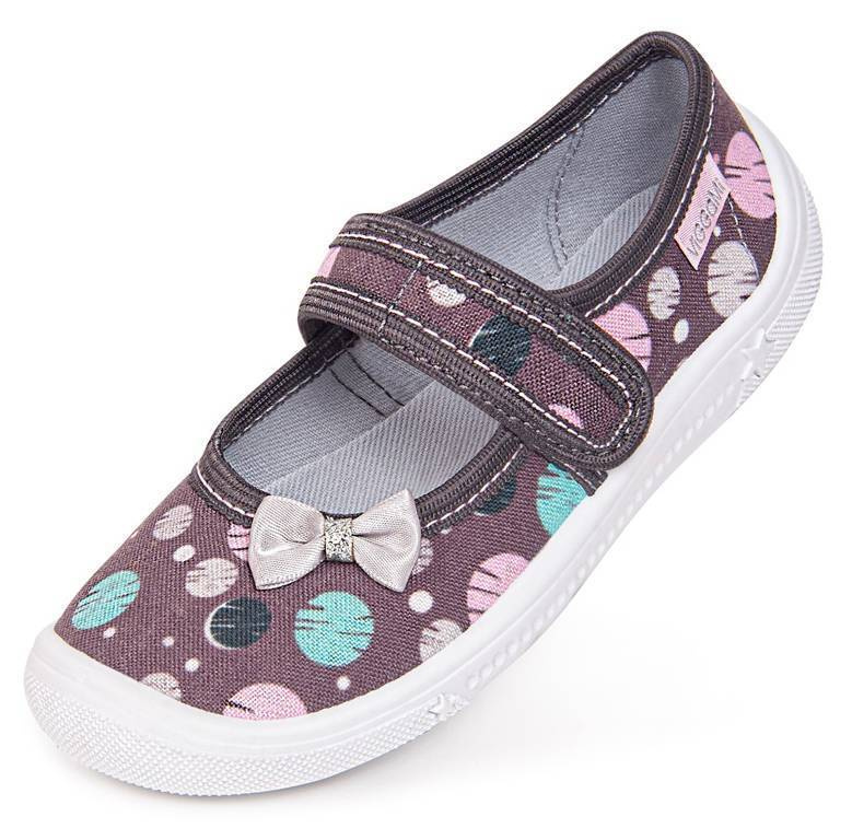 - Tenisówki dziecięce Viggami w szarym kolorze z ciekawym wzorkiem i kokardką. Kapcie są zapinanie na rzep co znacznie ułatwia samodzielne zakładanie obuwia przez dziecko. Posiadają certyfikat zdrowej stopy.