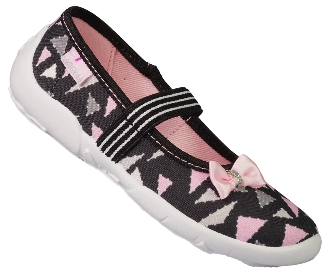 - Tenisówki dziecięce Viggami w granatowym kolorze z ciekawym wzorkiem i kokardką. Kapcie są wsuwane co znacznie ułatwia samodzielne zakładanie obuwia przez dziecko. Posiadają certyfikat zdrowej stopy.