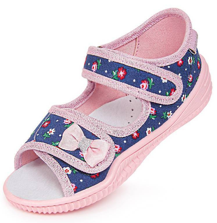 - Tenisówki dziecięce Viggami à la sandałki w granatowym kolorze z kolorowymi kwiatkami. Kapcie są zapinanie na rzep co znacznie ułatwia samodzielne zakładanie obuwia przez dziecko. Posiadają certyfikat zdrowej stopy.