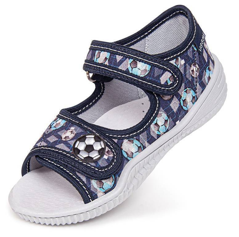 - Tenisówki dziecięce Viggami à la sandałki w granatowym kolorze z ozdobna grafiką w piłkarskim klimacie. Posiadają elastyczną antypoślizgową podeszwę. Kapcie są zapinanie na rzep co znacznie ułatwia samodzielne zakładanie obuwia przez dziecko.