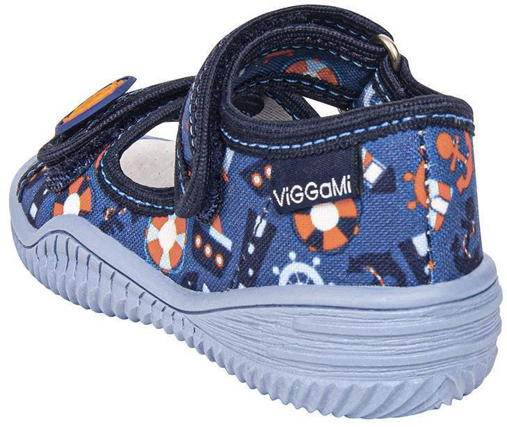 - Tenisówki dziecięce Viggami à la granatowym w szarym kolorze z ozdobna grafiką w morskim klimacie. Posiadają elastyczną antypoślizgową podeszwę. Kapcie są zapinanie na rzep co znacznie ułatwia samodzielne zakładanie obuwia przez dziecko.