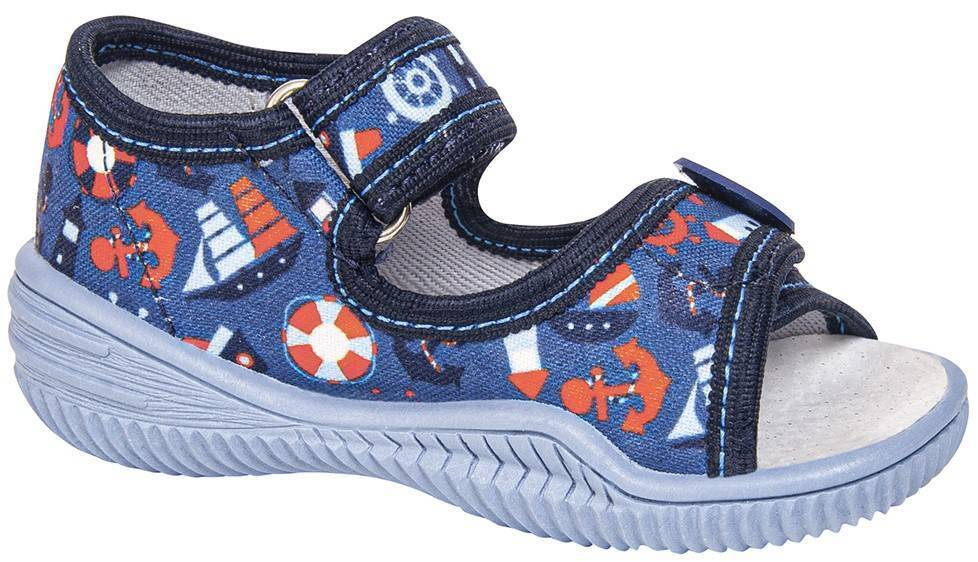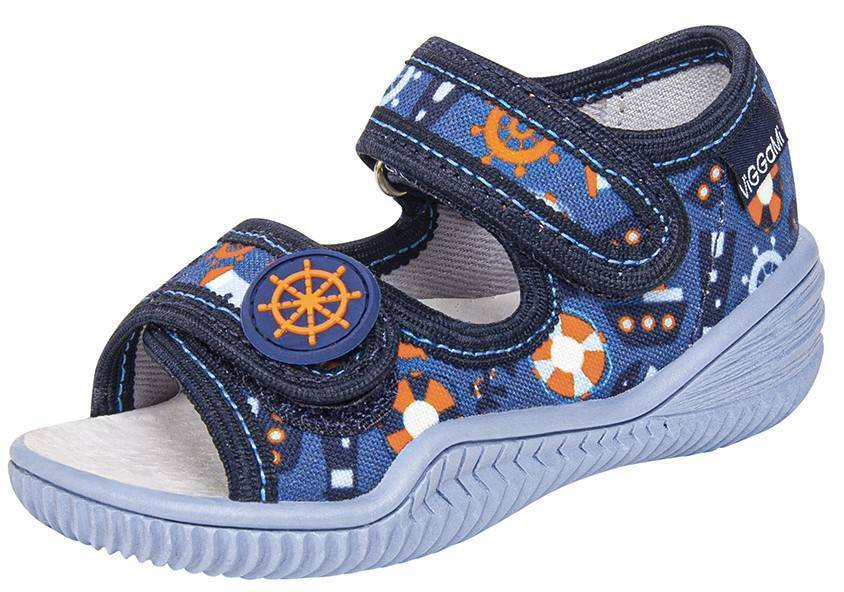 Tenisówki dziecięce Viggami à la sandałki w granatowym kolorze z ozdobna grafiką w morskim klimacie. Posiadają elastyczną antypoślizgową podeszwę która jest wentylowana od spodu, zapewnia ona wygodę, i bezpieczeństwo naszych pociech. Kapcie są zapinanie na rzep co znacznie ułatwia samodzielne zakładanie obuwia przez dziecko oraz zapewnia idealne dopasowanie się do stopy. Buciki sprawdzą się do przedszkola czy szkoły jak i harcowania po domu. Produkt jest stworzony w Polsce przez firmę Viggami. Buciki są lekkie wygodne i nie mają nosków co jeszcze bardziej poprawia wentylację, dodatkowo posiadają certyfikat zdrowej stopy który zapewnia , że obuwie wykonane jest prawidłowo pod względem konstrukcyjnym, technologicznym i materiałowym oraz prezentuje się estetycznie. Dzięki niemu Rodzice mają pewność, że stópki ich dzieci są bezpieczne i właściwie się rozwijają.
