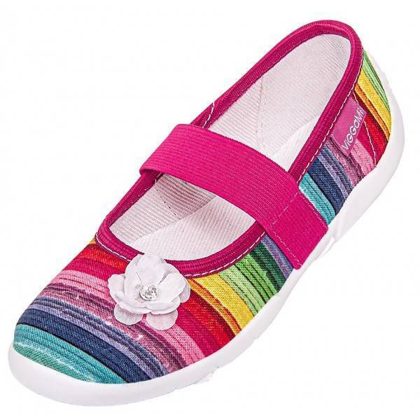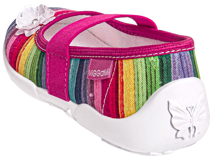 - Tenisówki dziecięce Viggami wielokolorowe, z białym kwiatuszkiem na przodzie. Kapcie są wsuwane co znacznie ułatwia samodzielne zakładanie obuwia przez dziecko. Posiadają certyfikat zdrowej stopy.