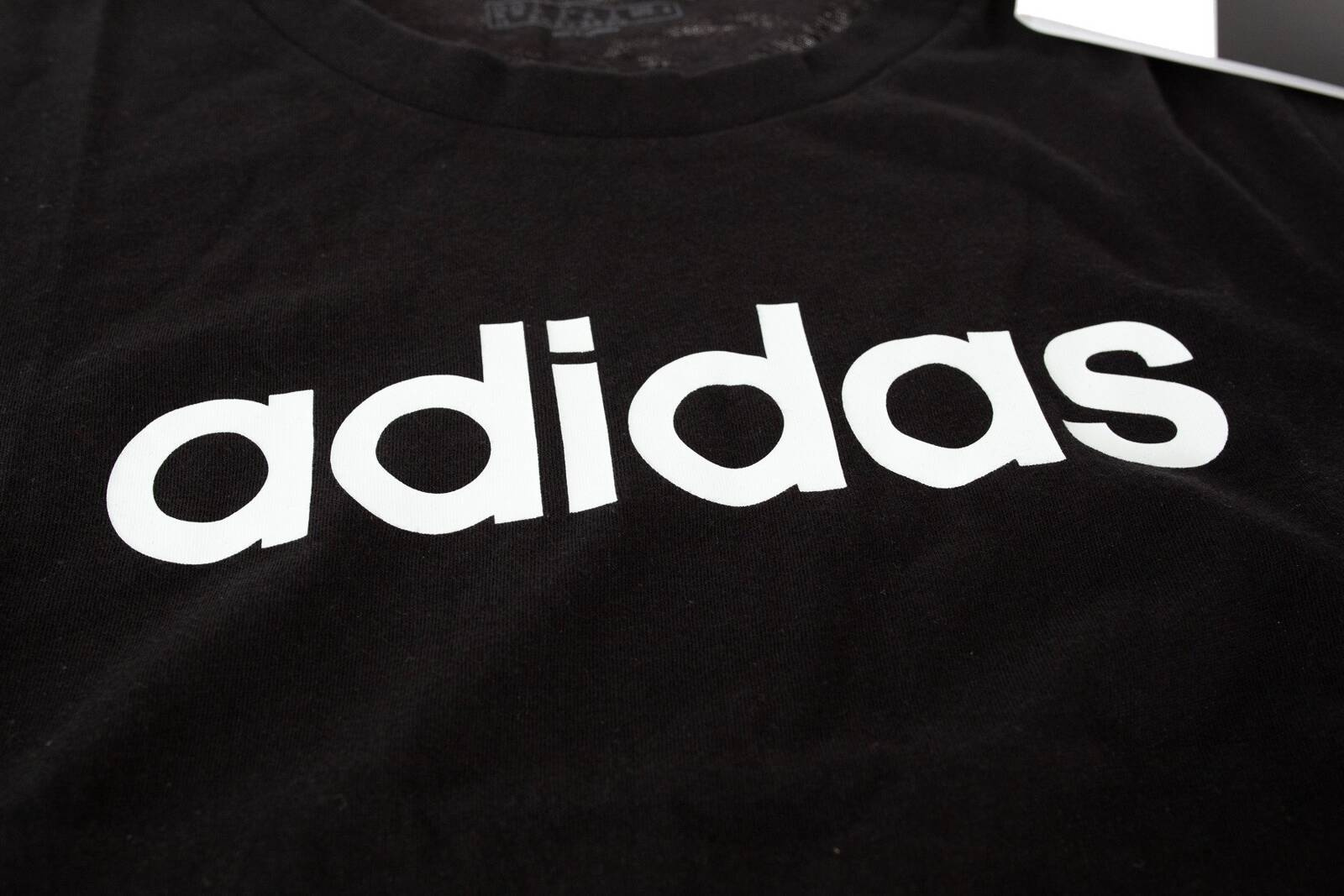- Damski T-shirt marki Adidas, w kolorze czarnym, z białym napisem z przodu. Koszulka pochodzi z serii Essentials i została wykonana w 100% z bawełny. Uniwersalny kolor i design sprawia, że jest to idealna opcja nie tylko na trening ale również na co dzień.