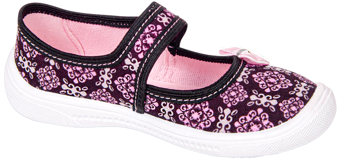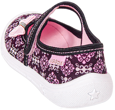- Tenisówki dziecięce Viggami w czarnym kolorze z ciekawym wzorkiem i kokardką. Kapcie są zapinanie na rzep co znacznie ułatwia samodzielne zakładanie obuwia przez dziecko. Posiadają certyfikat zdrowej stopy.