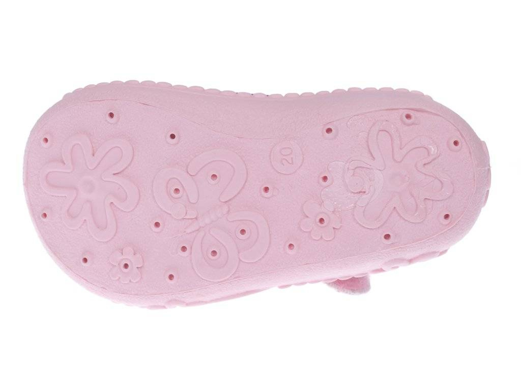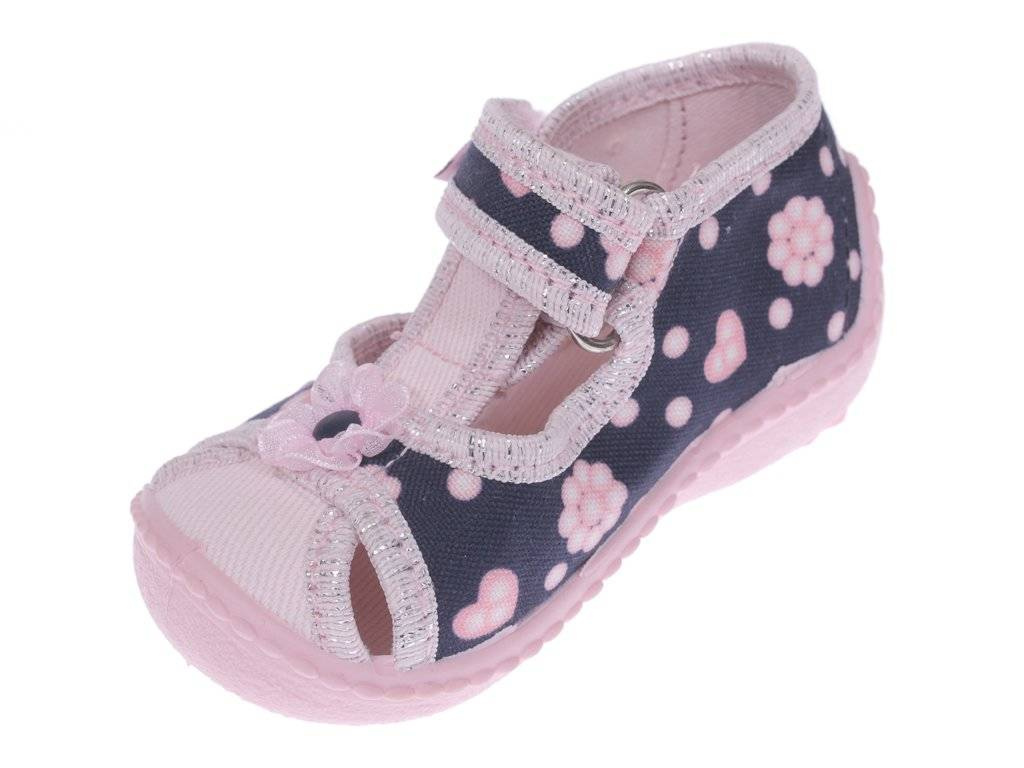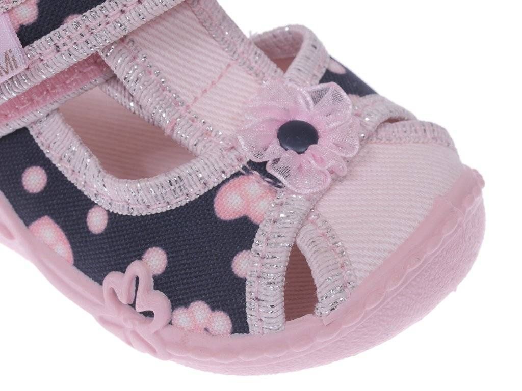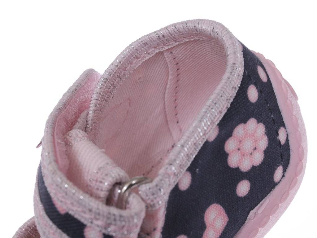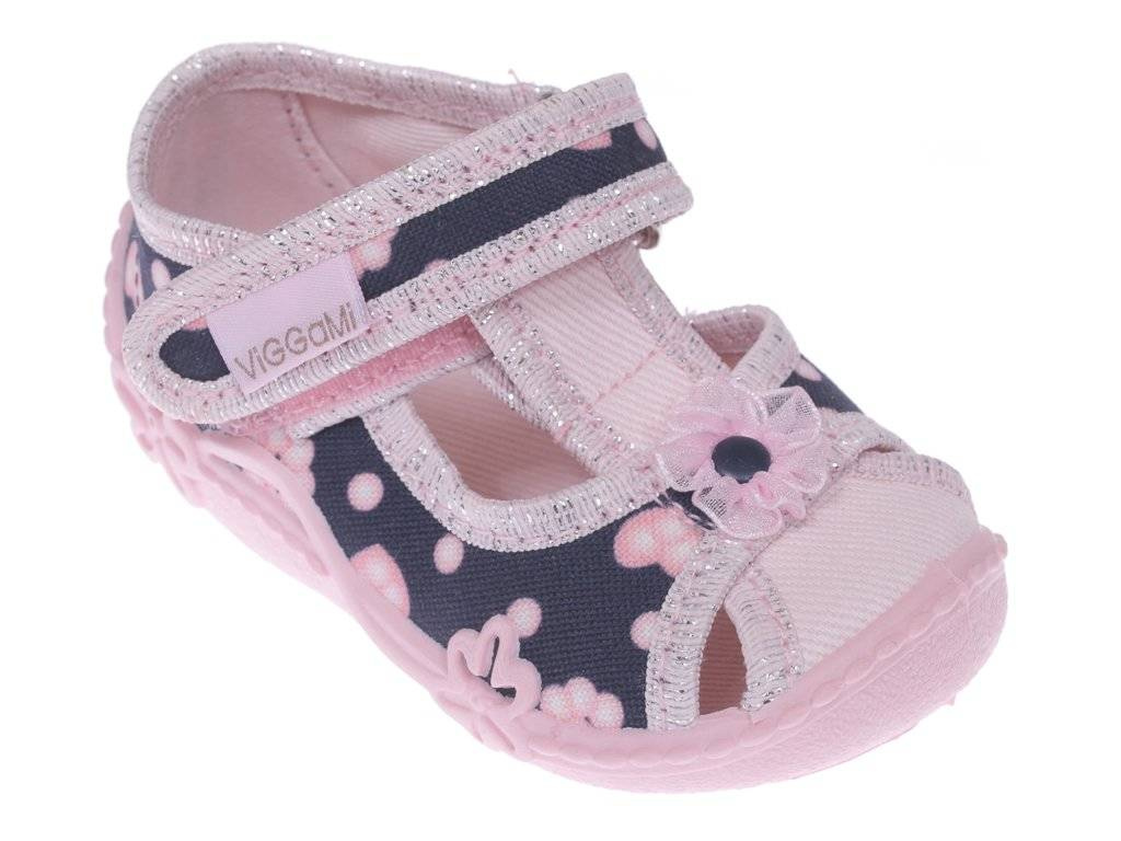 Tenisówki dziecięce Viggami granatowo-różowe, wykonane zostały z wysokiej jakości tkaniny w bardzo ładnym designie z ślicznym, dziewczęcym zdobieniem. Kapcie Viggami osadzone są na elastycznych podeszwach antypoślizgowych zapewniających bezpieczeństwo podczas zabawy. Dodatkowo podeszwy posiadają otwory gwarantujące prawidłowy przepływ powietrza co w dużym stopniu wpływa na komfort podczas użytkowania. Model ten zapinany jest na rzep co umożliwia na samodzielne zakładanie obuwia przez dziecko oraz zapobiega zsuwaniu się kapci ze stopy. Półotwarte noski gwarantują świetną wentylację a buty same w sobie są bardzo lekkie i wygodne, idealnie sprawdzą się do przedszkola bądź do codziennego użytku.