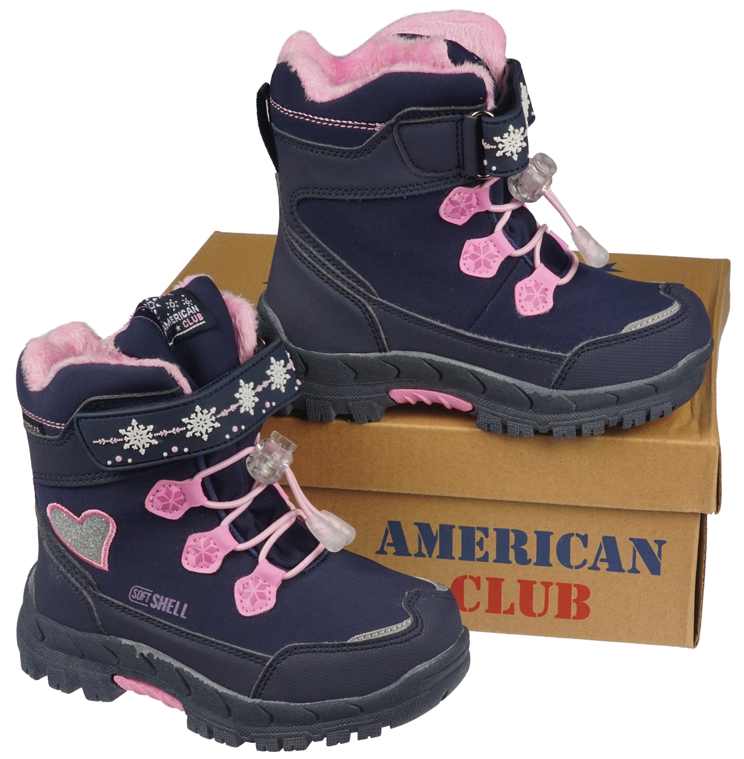 - Zimowe buty dziecięce Firmy American Club w kolorze granatowym. Zostały wykonane z wysokiej jakości materiałów, posiadają cholewkę Softshell która chroni prze niską temperaturą wiatrem, deszczem oraz śniegiem.