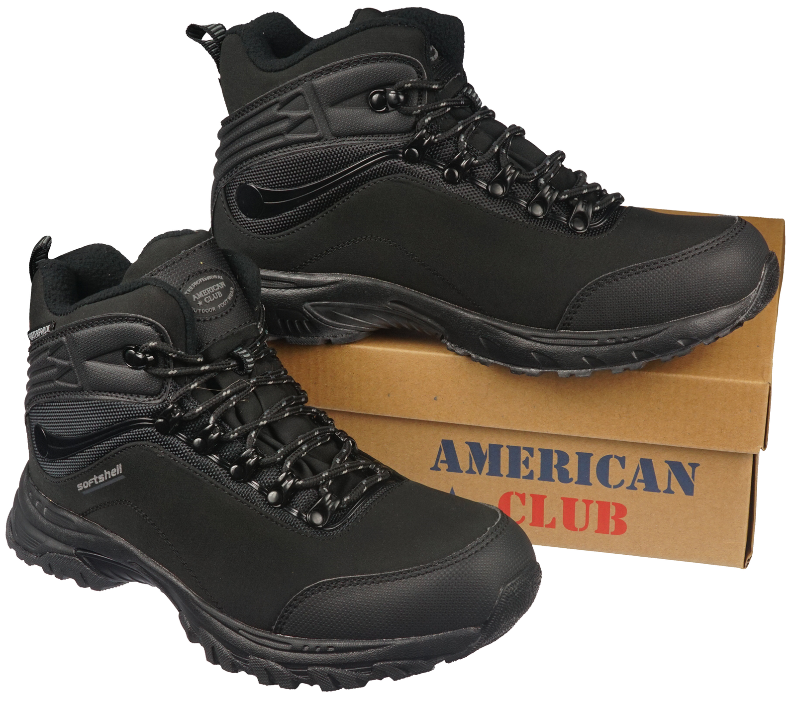 - Zimowe buty męskie Firmy American Club w kolorze czarnym. Obuwie solidne, wygodne i ładnie się prezentuje. Buty posiadają cholewkę Softshell która chroni przed niską temperaturą, dodatkowo wodoodporną membranę Tripletex.