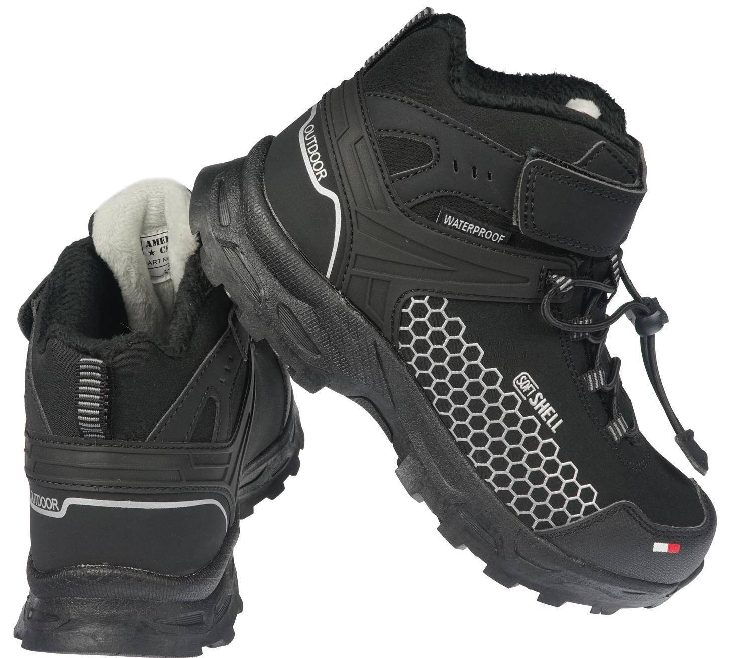 Zimowe buty dziecięce Firmy American Club w kolorze czarnym. Obuwie Softshell jest solidne, wygodne i ładnie się prezentuje. Buty zostały wykonane z wysokiej jakości materiałów, posiadają cholewkę Softshell, która chroni przed niską temperaturą, wiatrem, deszczem oraz śniegiem. Dodatkowo obuwie dziecięce posiada wodoodporną membranę Tripletex. Gruba podeszwa z bieżnikiem zapewnia dobrą przyczepność do podłoża oraz wygodę użytkowania. Wnętrze buta jest ocieplane co zapewni odpowiednią temperaturę nawet podczas zimowych dni. Dodatkowymi plusami są ściągacz zamiast wiązania oraz rzep które sprawiają, że buty idealnie dopasowują się do stopy oraz ułatwiają i przyspieszają ich zakładanie. Podsumowując, ocieplane buty w idealny sposób sprawdzą się w jesienne oraz zimowe dni do codziennego użytku czy też w górskie wyprawy.