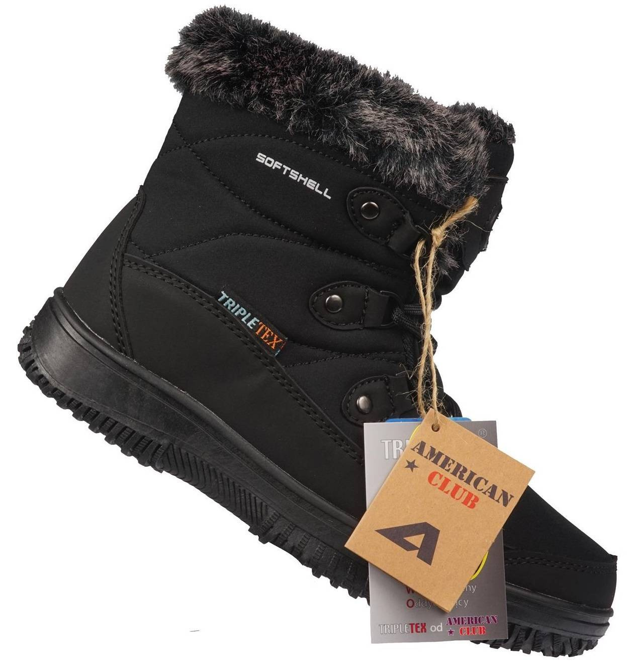 - Zimowe buty damskie Firmy American Club w kolorze czarnym. Posiadają cholewkę Softshell która chroni przed niską temperaturą, wiatrem, deszczem oraz śniegiem. Dodatkowo posiadają wodoodporną membranę Tripletex.