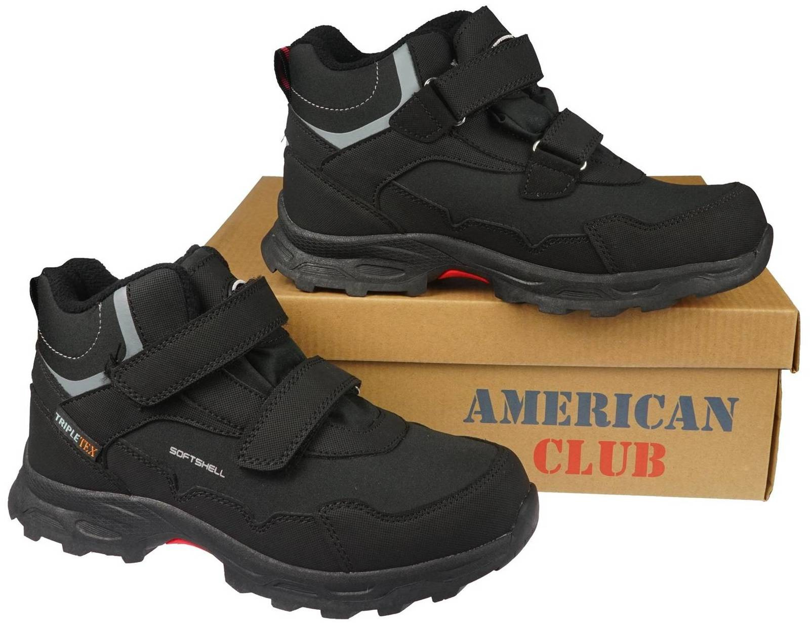- Zimowe buty damskie Firmy American Club w kolorze czarnym. Posiadają cholewkę Softshell która chroni przed niską temperaturą, wiatrem, deszczem oraz śniegiem. Dodatkowo posiadają wodoodporną membranę Tripletex.
