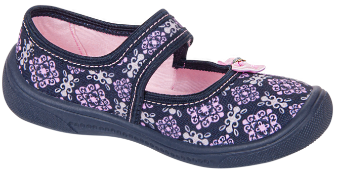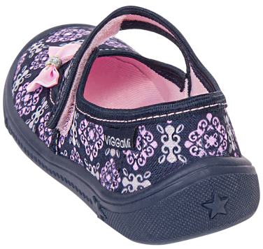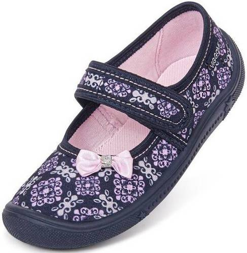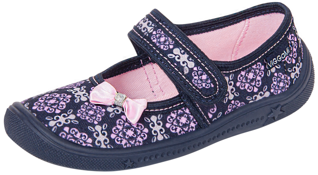 Tenisówki dziecięce Viggami w granatowym kolorze z różowymi elementami z pięknym wzorem koronki na całej powierzchni. Nadaje on całości bardzo dziewczęcego charakteru i sprawia że model ten jest jedyny w swoim rodzaju. Elastyczne podeszwy antypoślizgowe zapewniają bezpieczeństwo podczas zabawy. Dodatkowo podeszwy posiadają specjalne otwory gwarantujące prawidłowy przepływ powietrza co w dużym stopniu wpływa na komfort podczas użytkowania. Model ten zapinany jest na rzep co umożliwia na samodzielne zakładanie obuwia przez dziecko oraz zapobiega zsuwaniu się kapci ze stopy. Kapcie Viggami są bardzo lekkie i wygodne, idealnie sprawdzą się do przedszkola bądź do codziennego użytku.