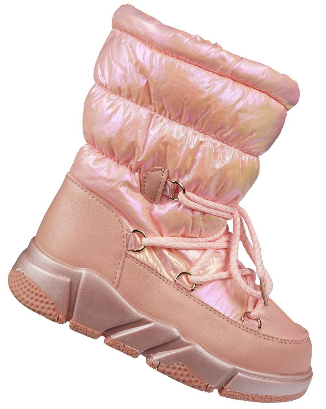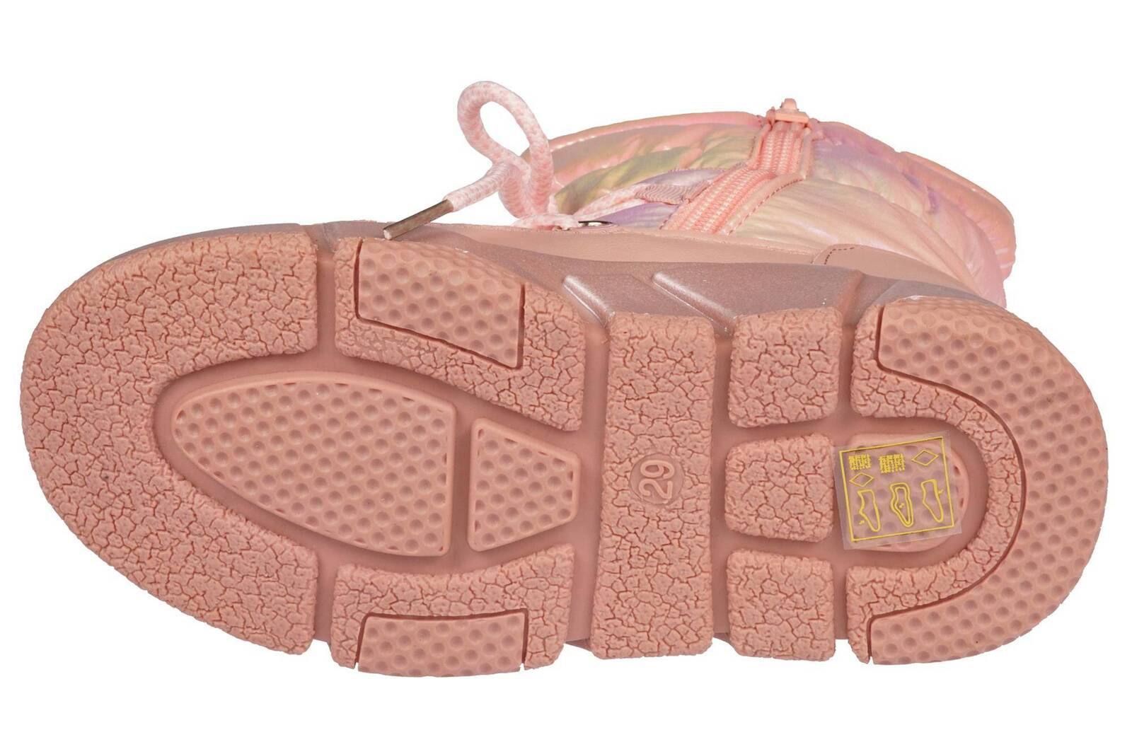- Wysokie buty zimowe dla dziecka w kolorze różowym z piękną, mieniącą się poświatą. Wykonane z ortalionu, który chroni przed wodą, wiatrem i zimnem. Wewnątrz ciepły polar zapewnia ciepło i wygodę.
