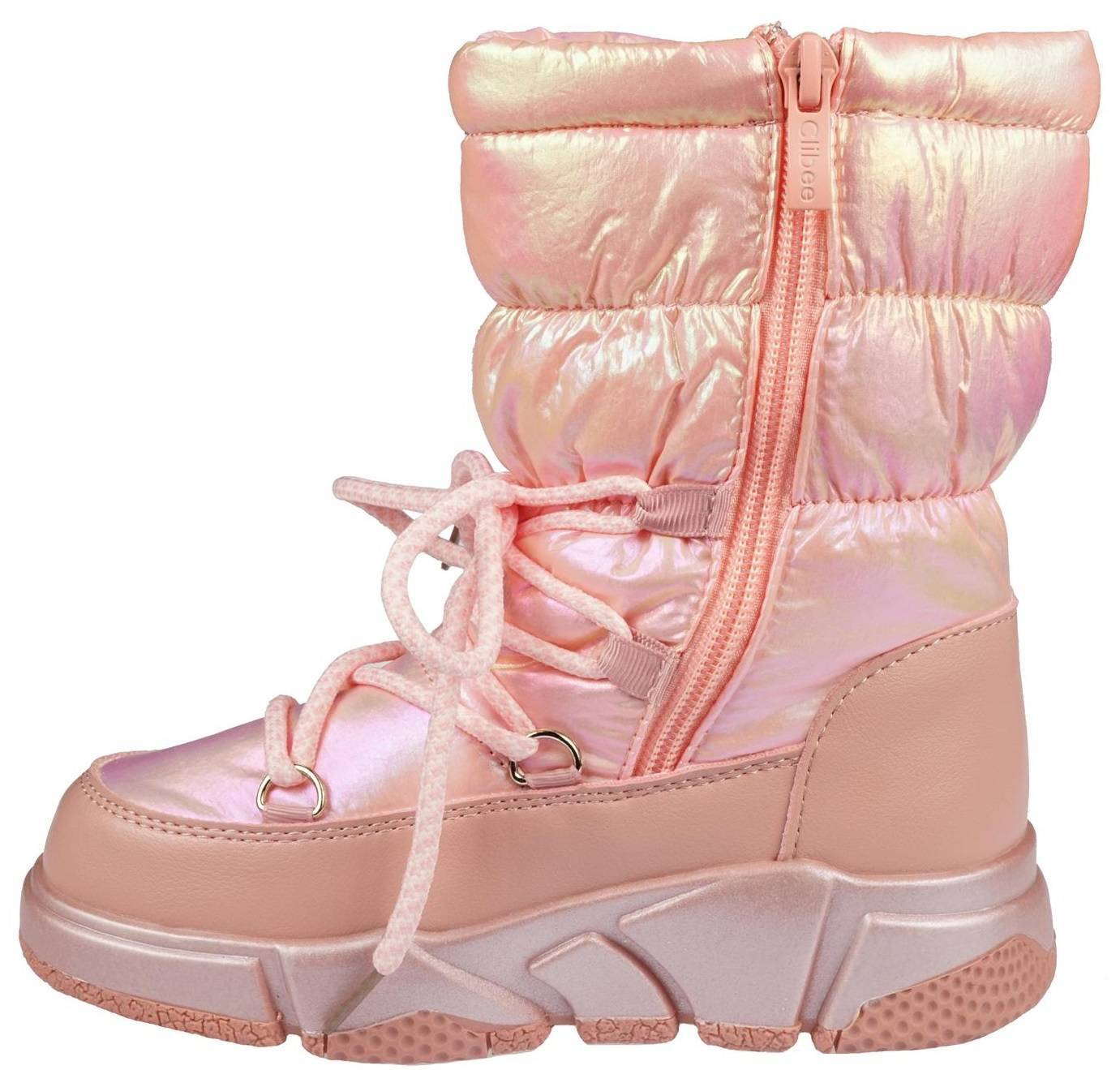 Zimowe buty dziecięce Firmy Clibee w kolorze różowym z metalicznym wykończeniem. Wysokie buty za kostkę wykonane z ortalionu, materiał ten jest wodoodporny i doskonale chroni podczas chłodu, deszczu i wiatru. Gruba gumowa podeszwa z bieżnikiem zabezpiecza przed poślizgnięciami na śliskich powierzchniach. Wnętrze buta dziecięcego jest ocieplane co zapewnia odpowiednią temperaturę nawet podczas zimowych dni. Zamek ułatwia zakładanie bucików, a ściągacz pozwala na idealne dopasowanie co pozwala na stabilizacje kostki. Materiał z jakich został wykonany ten produkt sprawia, że będzie go łatwo czyścić, a ciekawa kolorystyka z pięknym połyskiem tworzy go unikatowym. Podsumowując, buty w idealny sposób sprawdzą się w jesienne oraz zimowe dni do codziennego użytku.