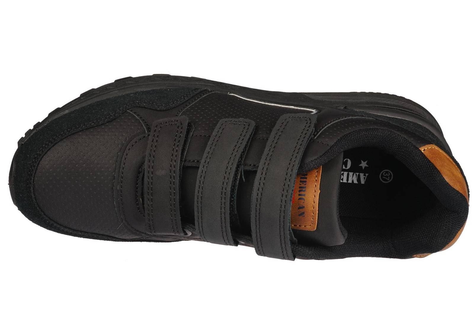 • Młodzieżowe buty sportowe Firmy American Club w kolorze czarnym. Stylowe wygodne i lekkie obuwie, jest zapinane na rzepy, posiada sztywny zapiętek. Buty mają piankową podeszwę z gumowym spodem co zapewnia dobrą przyczepność do podłoża.