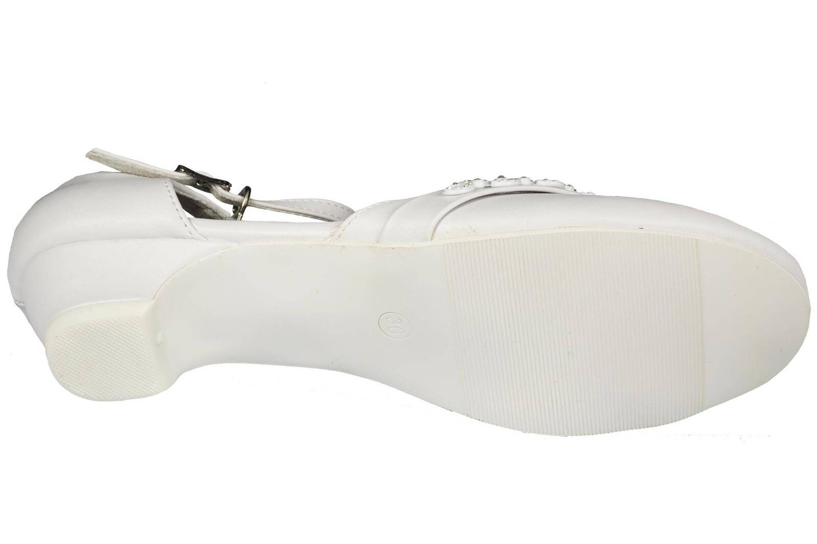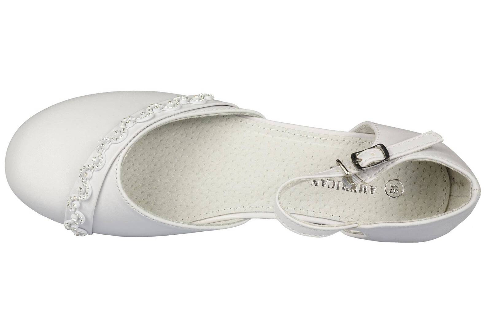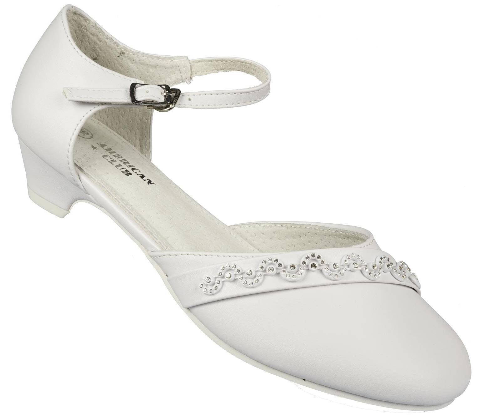 - Eleganckie półbuty dziewczęce firmy American Club w klasycznym białym kolorze ozdobami na przodzie. Zapinane są na metalową klamerkę na pasku. Idealnie sprawdzą się na specjalne okazje.