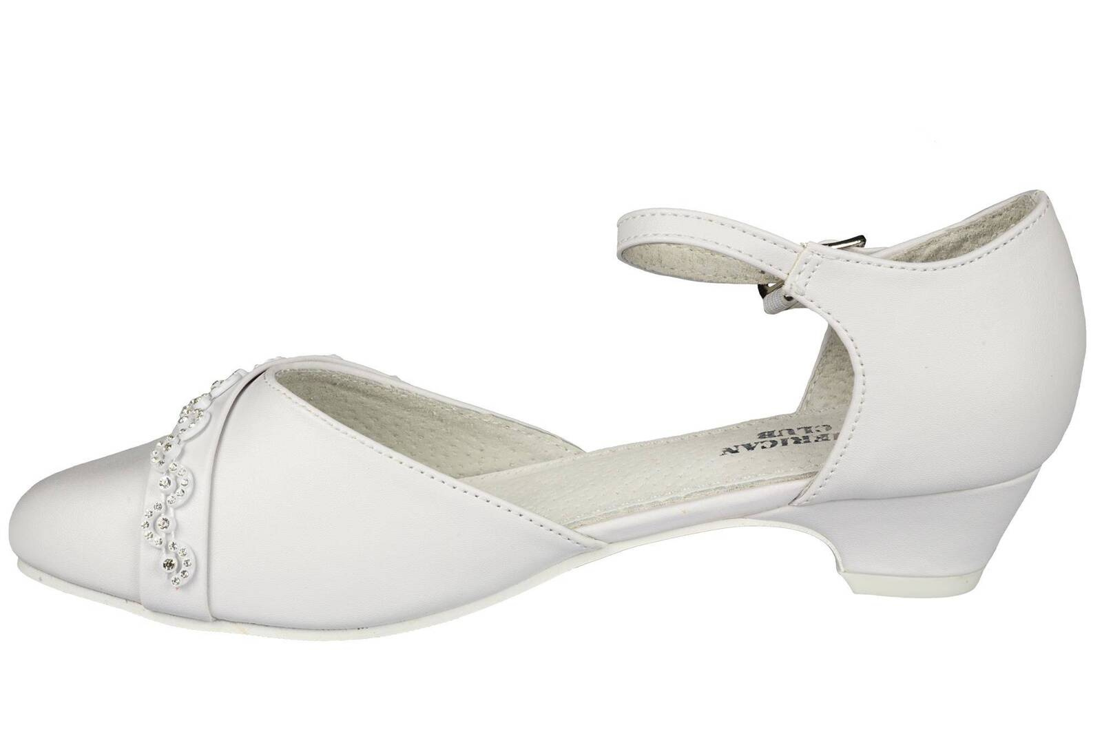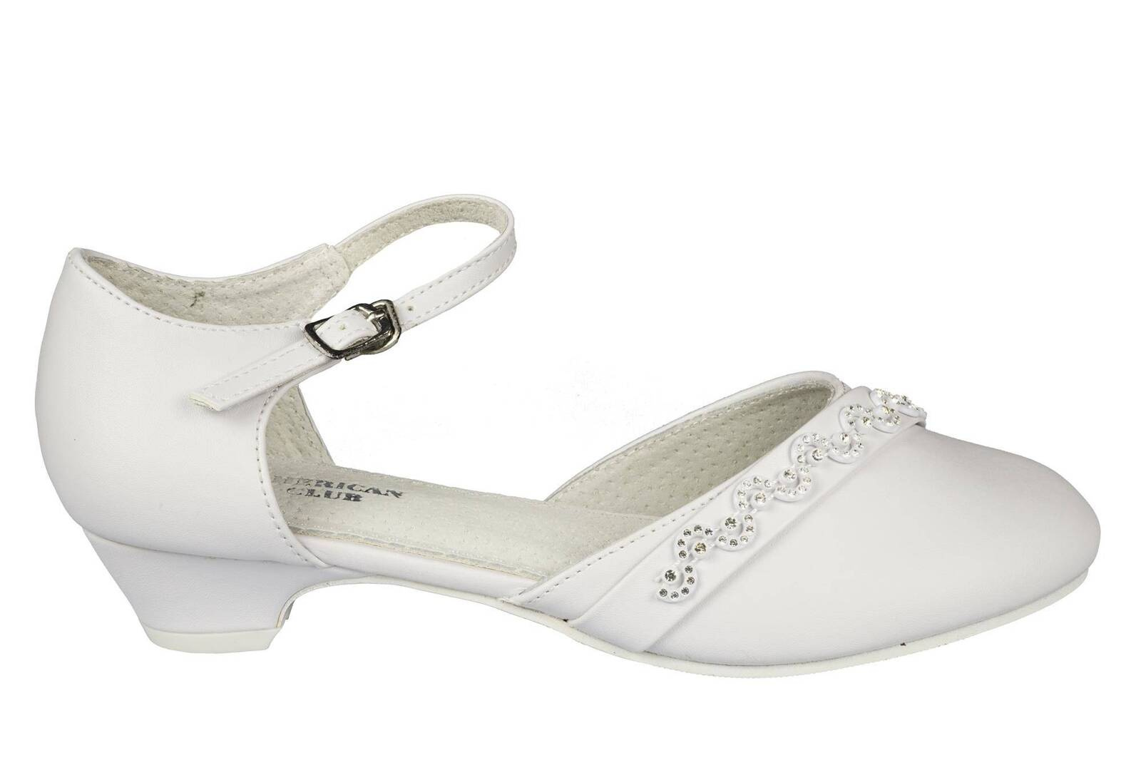 Eleganckie półbuty dziewczęce firmy American Club w klasycznym białym kolorze ozdobami na przodzie. Wykonane zostały bardzo solidnie i starannie ze skóry ekologicznej. Posiadają obcas, który dodaje kilku centymetrów, a w połączeniu z wkładką skórzaną zapewnia wysoki komfort podczas użytkowania. Zapinane są na metalową klamerkę na pasku, dzięki temu można je idealnie dopasować do stopy. Idealnie sprawdzą się na specjalne okazje.