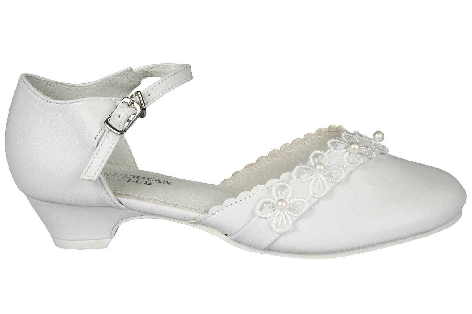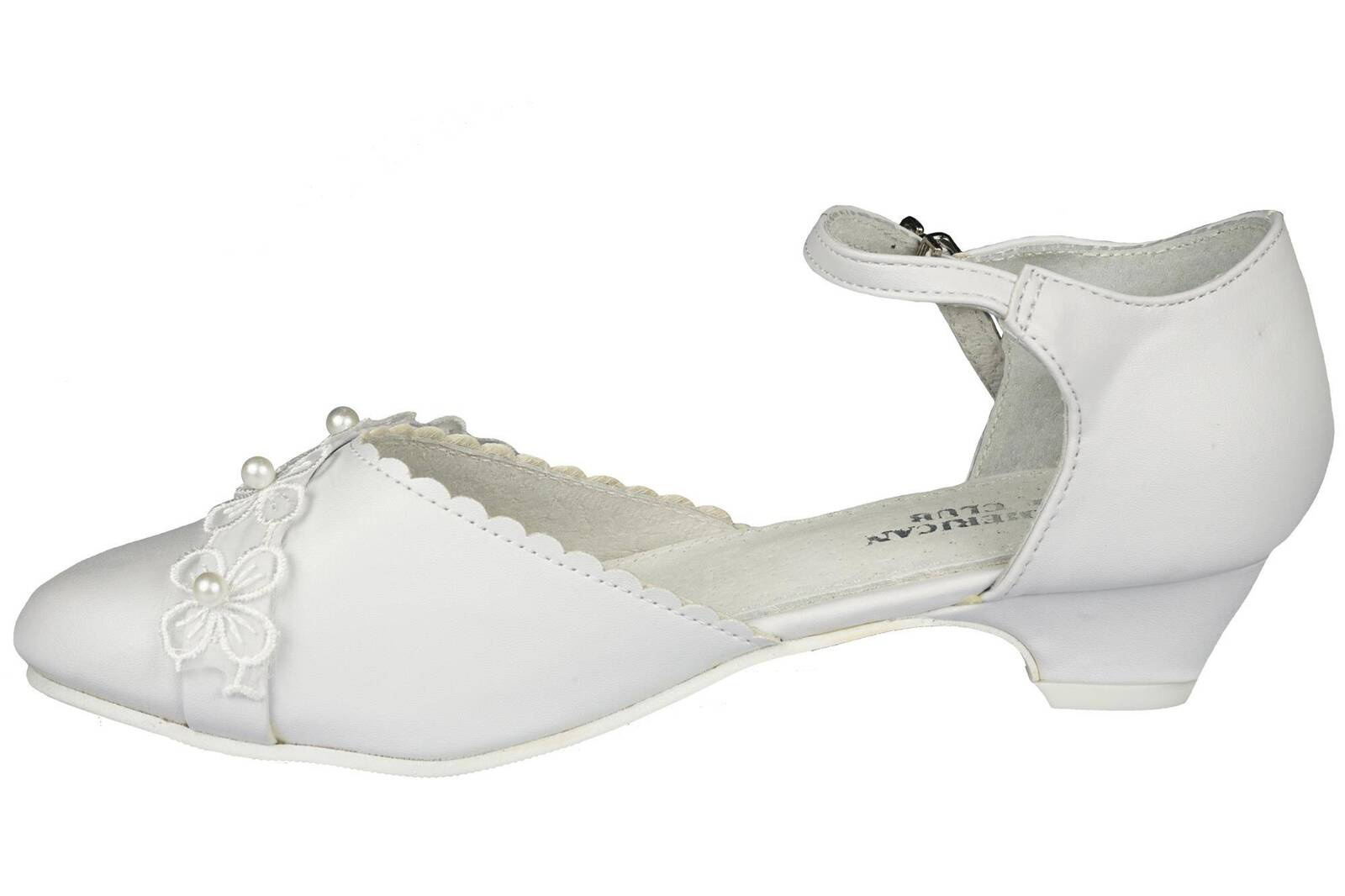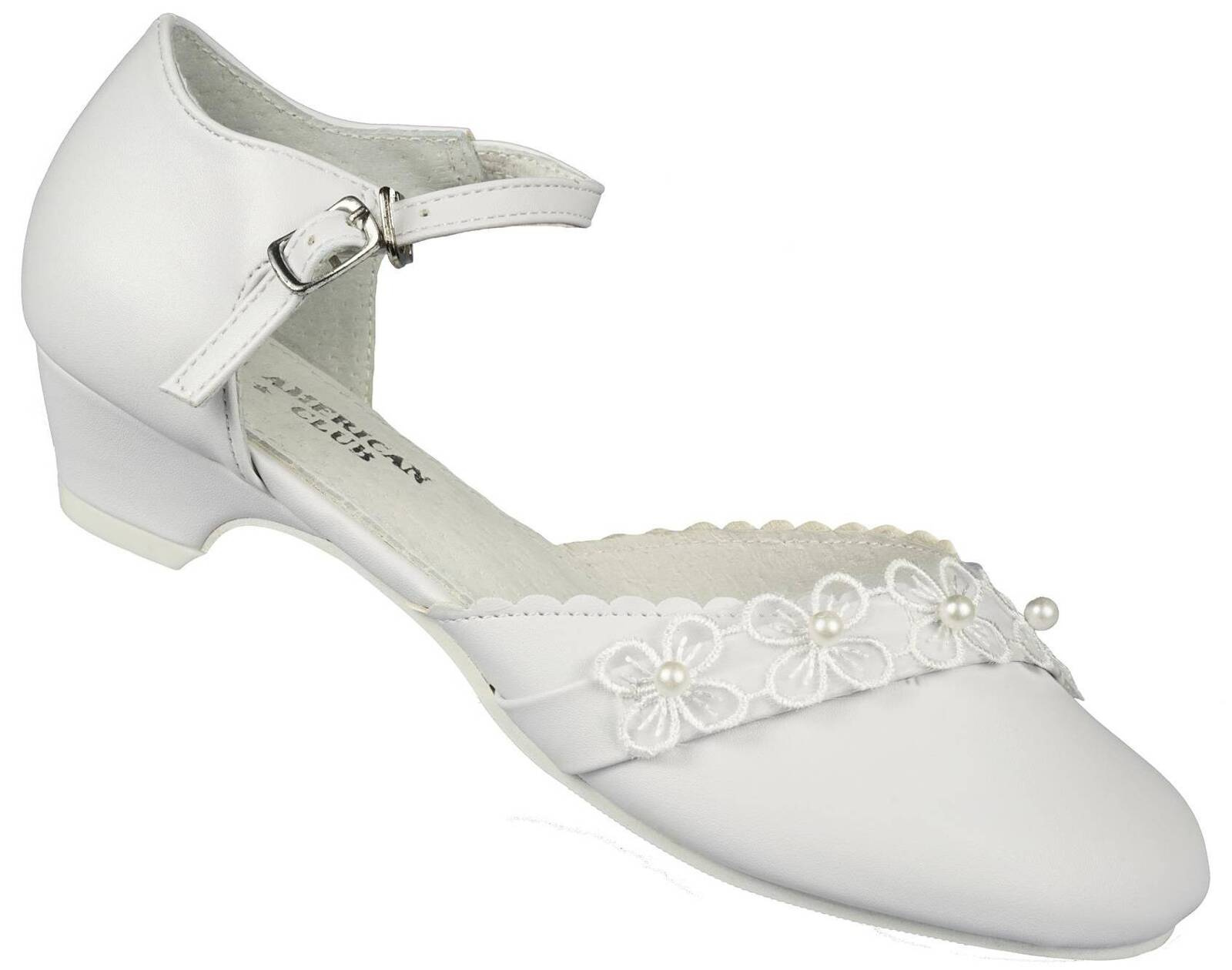 - Eleganckie półbuty dziewczęce firmy American Club w klasycznym białym kolorze ozdobami na przodzie. Zapinane są na metalową klamerkę na pasku. Idealnie sprawdzą się na specjalne okazje.