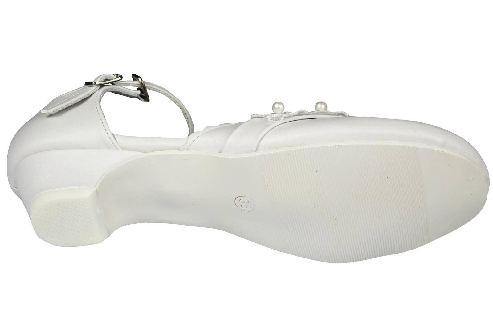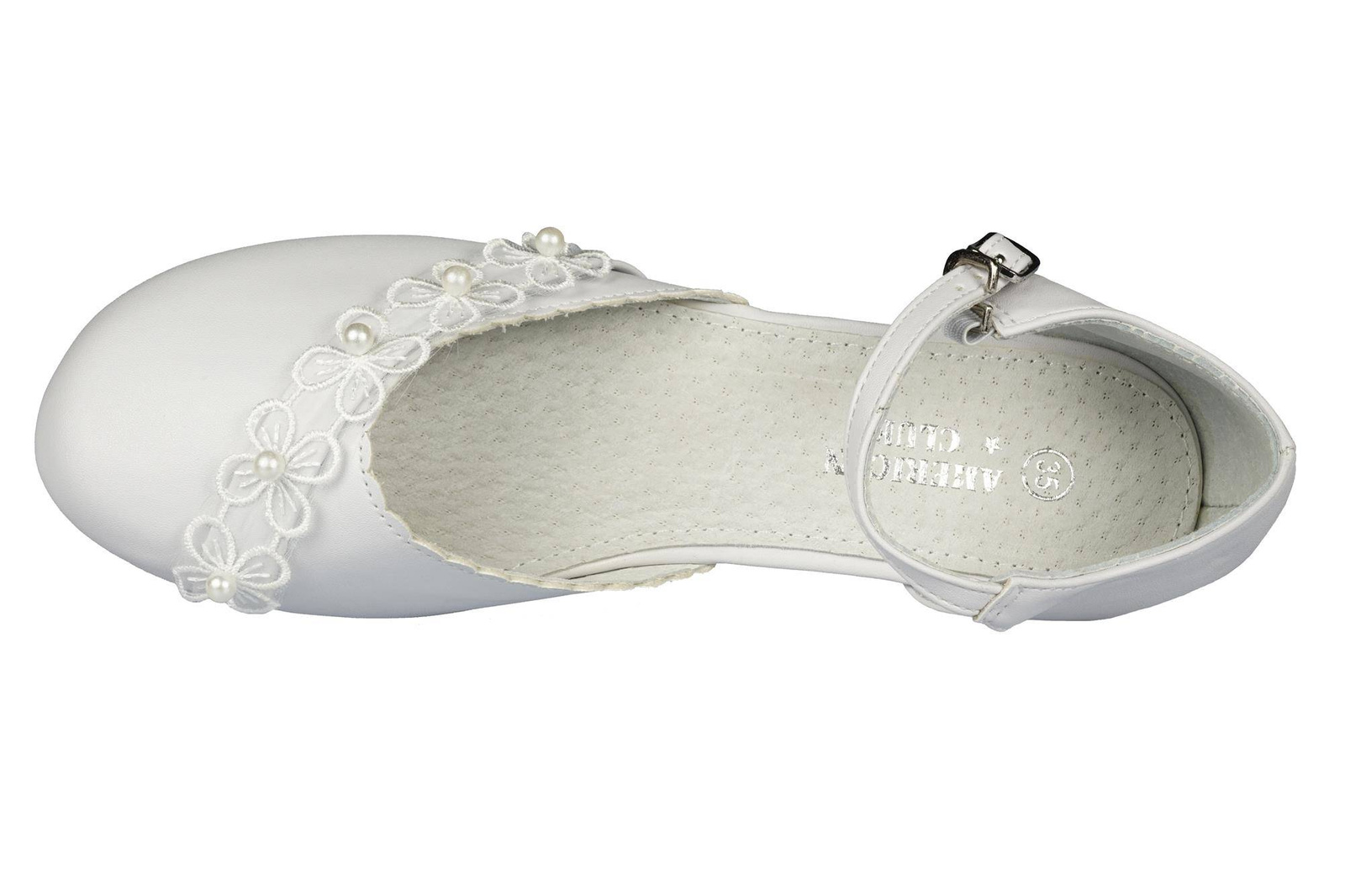 Eleganckie półbuty dziewczęce firmy American Club w klasycznym białym kolorze z ozdobami na przodzie. Wykonane zostały bardzo solidnie i starannie ze skóry ekologicznej. Posiadają obcas, który dodaje kilku centymetrów, a w połączeniu z wkładką skórzaną zapewnia wysoki komfort podczas użytkowania. Zapinane są na metalową klamerkę na pasku, dzięki temu można je idealnie dopasować do stopy. Są świetnym wyborem na specjalne okazje.