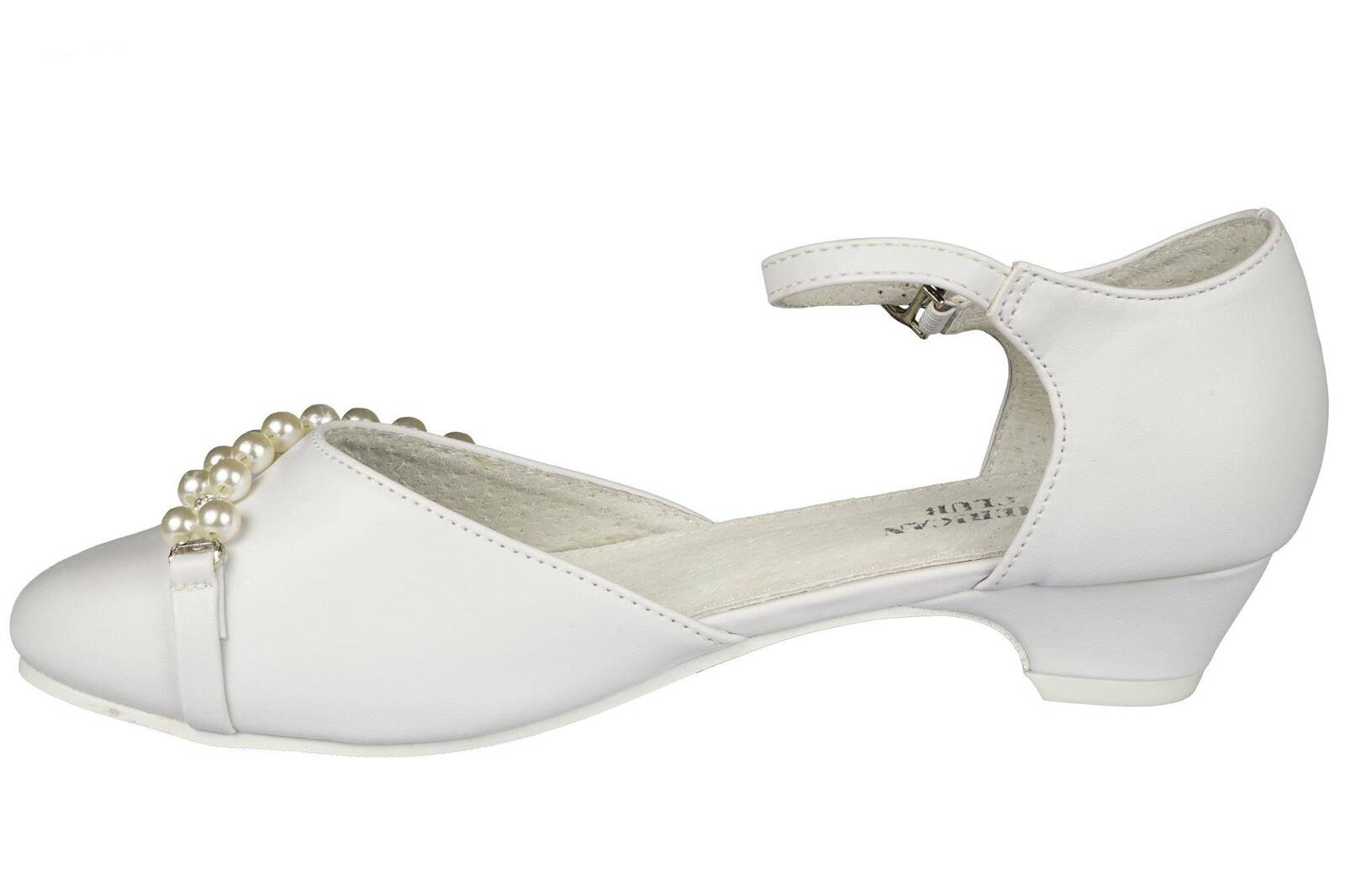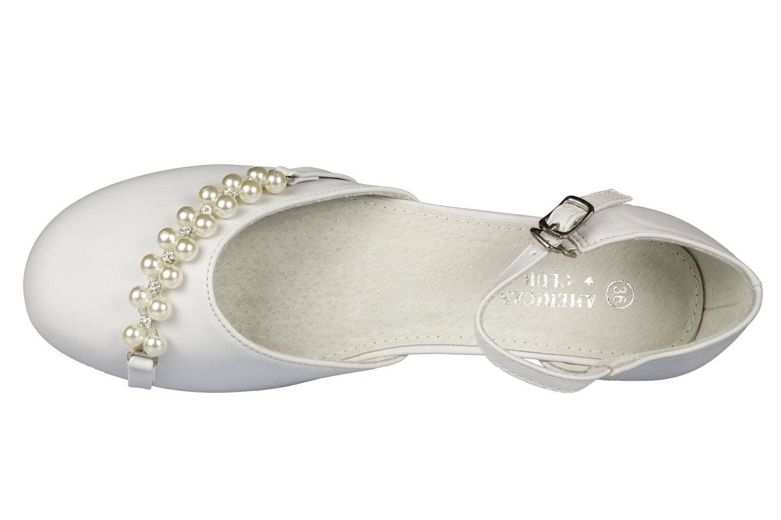 Eleganckie półbuty dziewczęce firmy American Club w klasycznym białym kolorze z ozdobami na przodzie. Wykonane zostały bardzo solidnie i starannie ze skóry ekologicznej. Posiadają obcas, który dodaje kilku centymetrów, a w połączeniu z wkładką skórzaną zapewnia wysoki komfort podczas użytkowania. Zapinane są na metalową klamerkę na pasku, dzięki temu można je idealnie dopasować do stopy. Są świetnym wyborem na specjalne okazje.