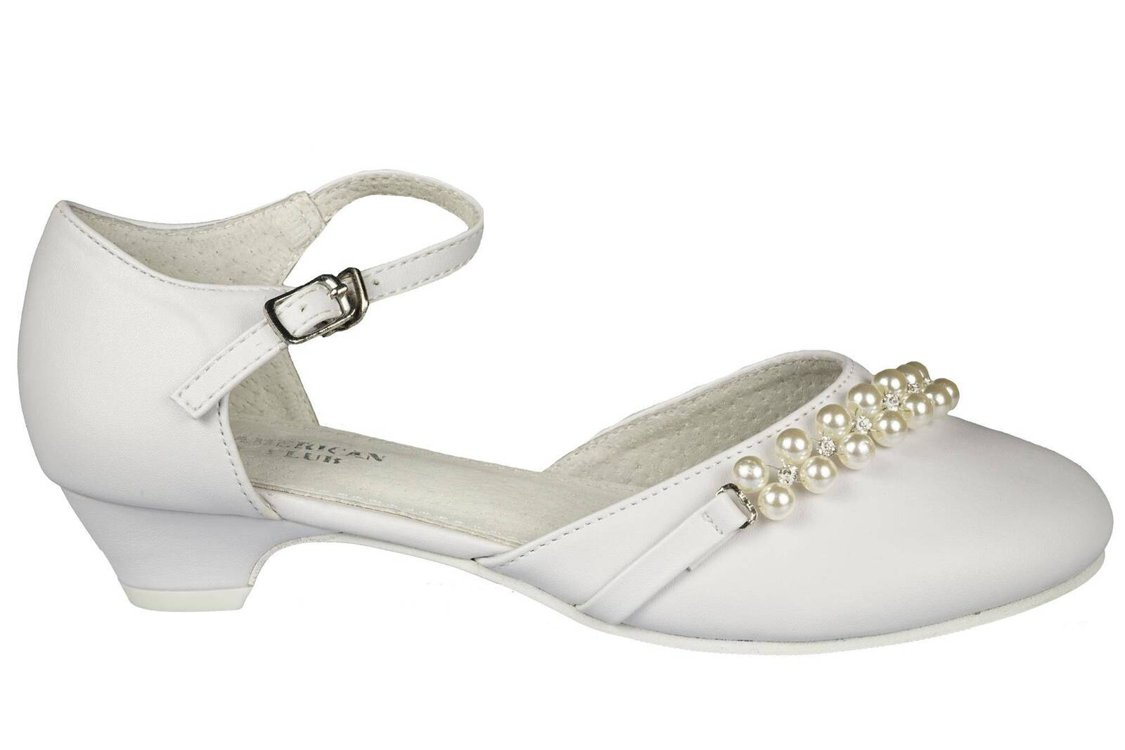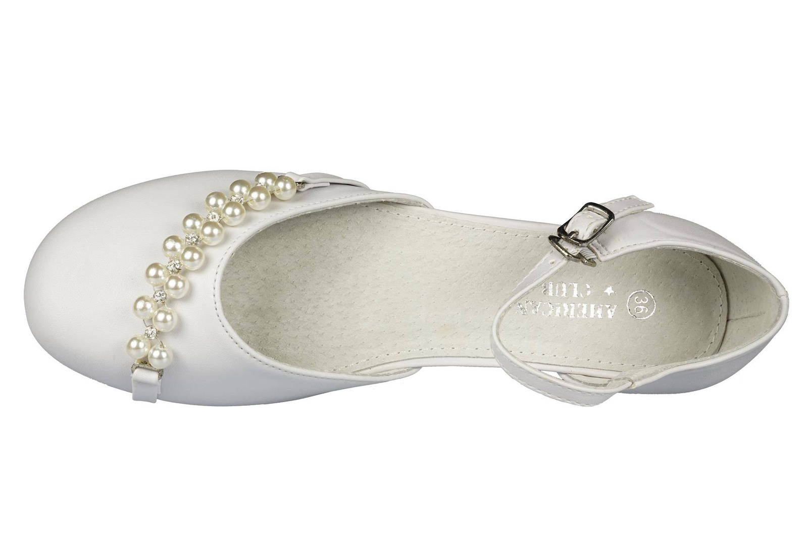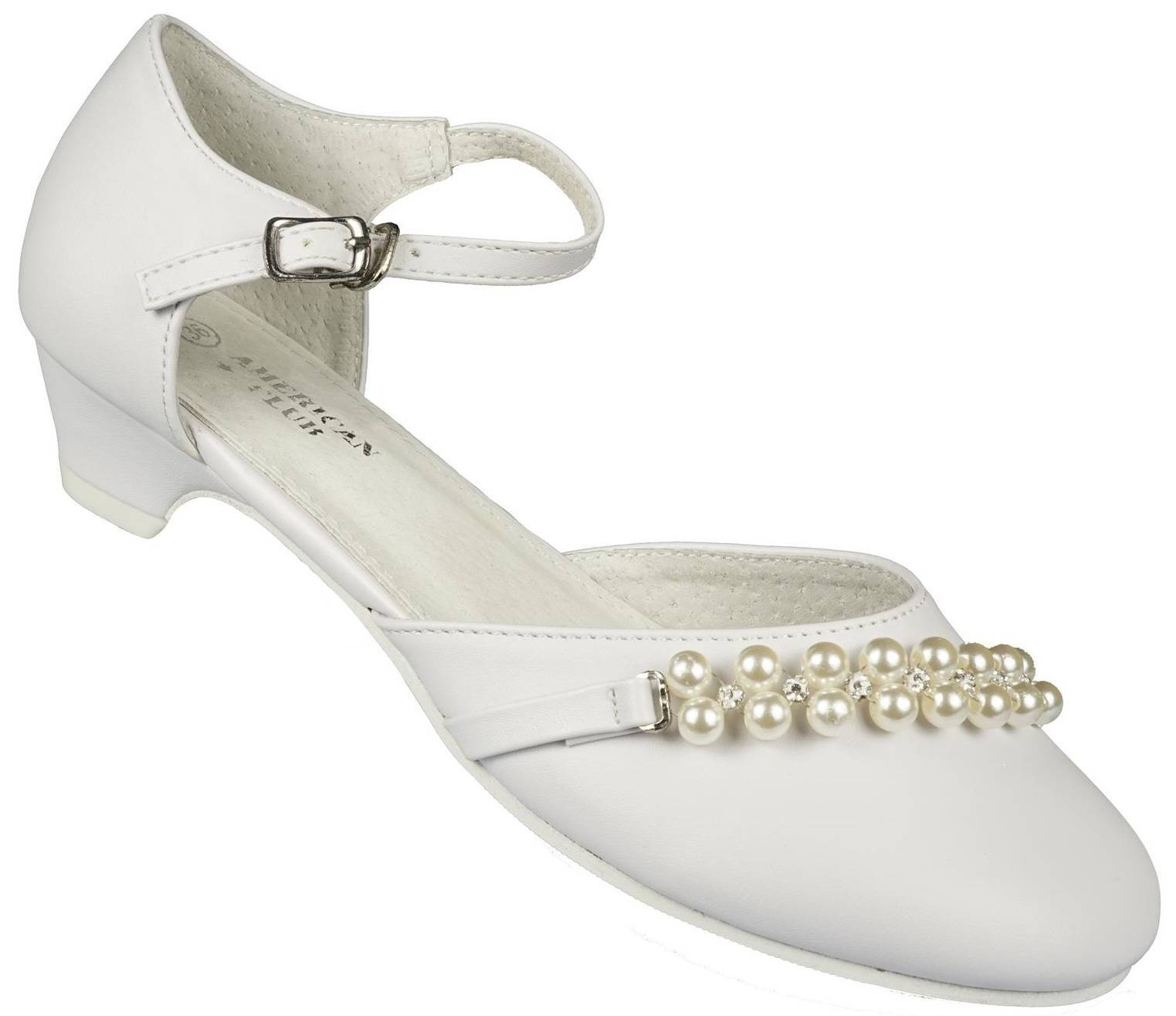 - Eleganckie półbuty dziewczęce firmy American Club w klasycznym białym kolorze ozdobami na przodzie. Zapinane są na metalową klamerkę na pasku. Idealnie sprawdzą się na specjalne okazje.