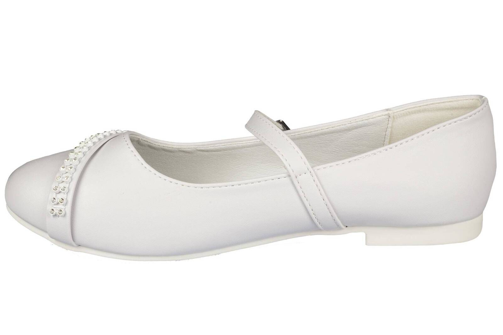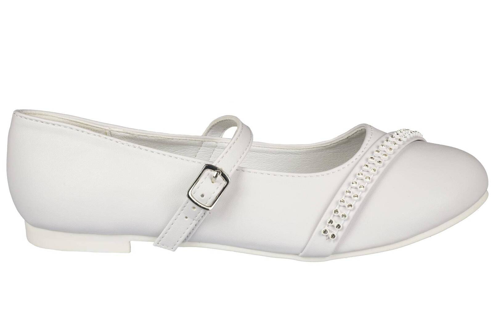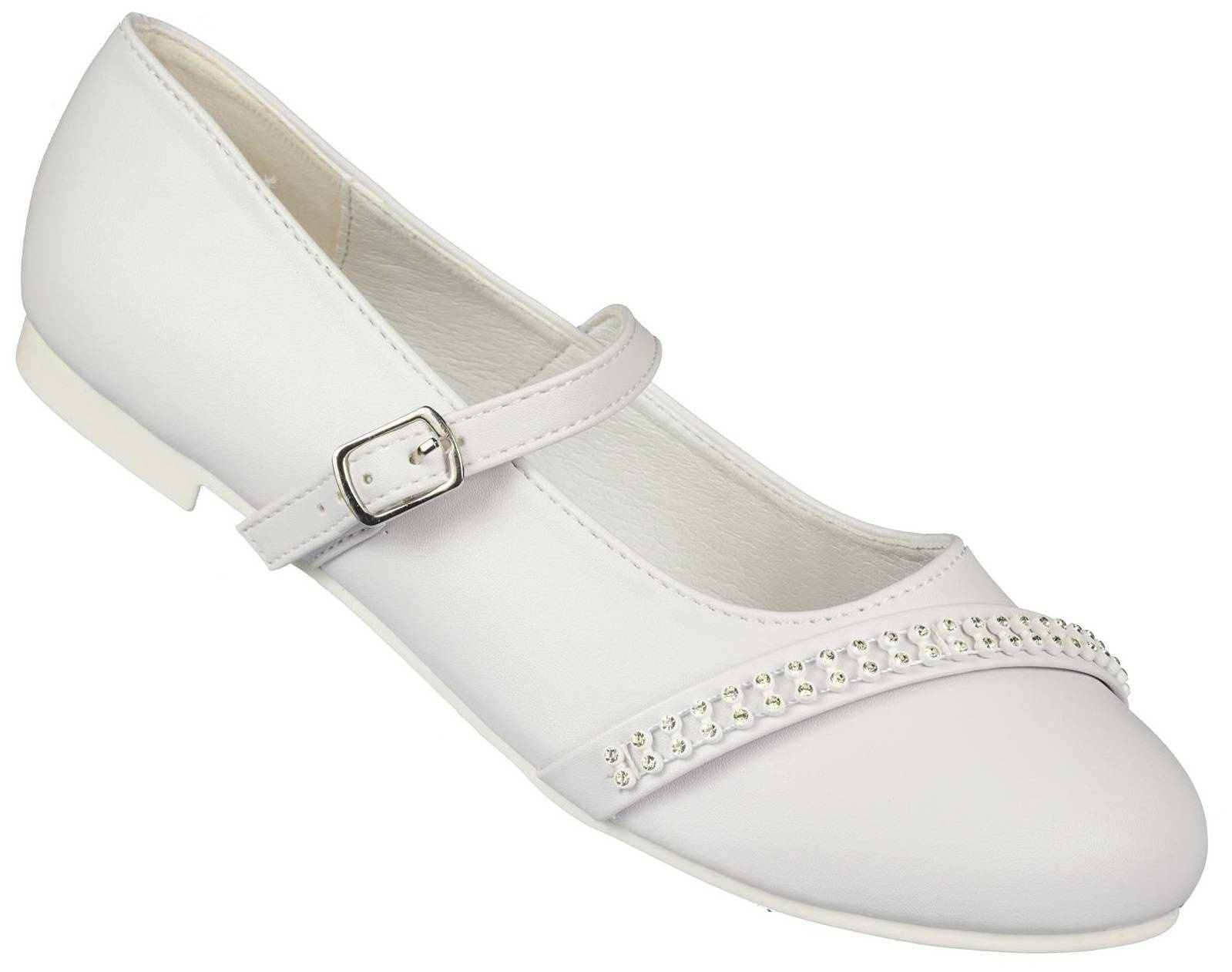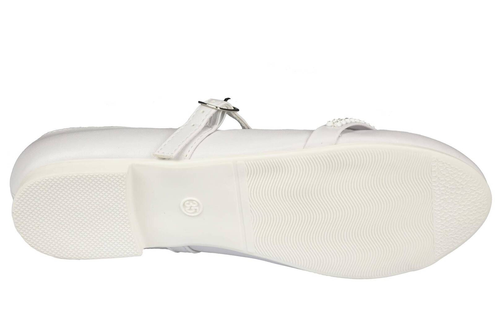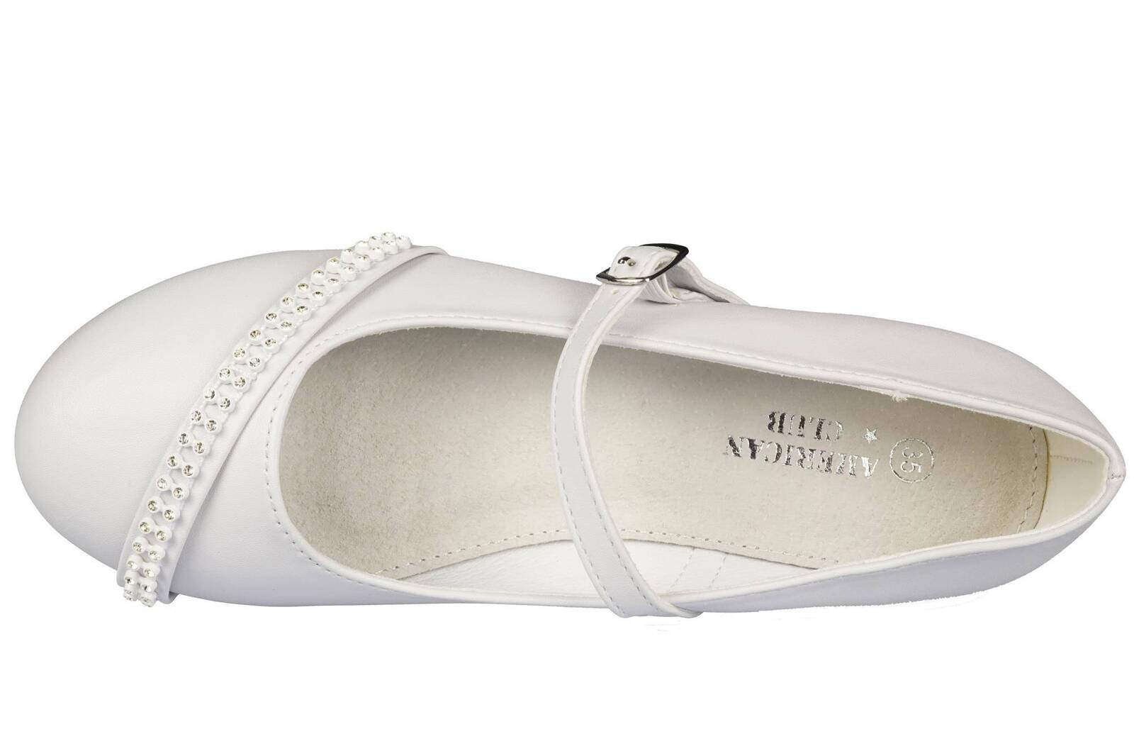 - Eleganckie półbuty dziewczęce firmy American Club w klasycznym białym kolorze ozdobami na przodzie. Zapinane są na metalową klamerkę na pasku. Idealnie sprawdzą się na specjalne okazje.