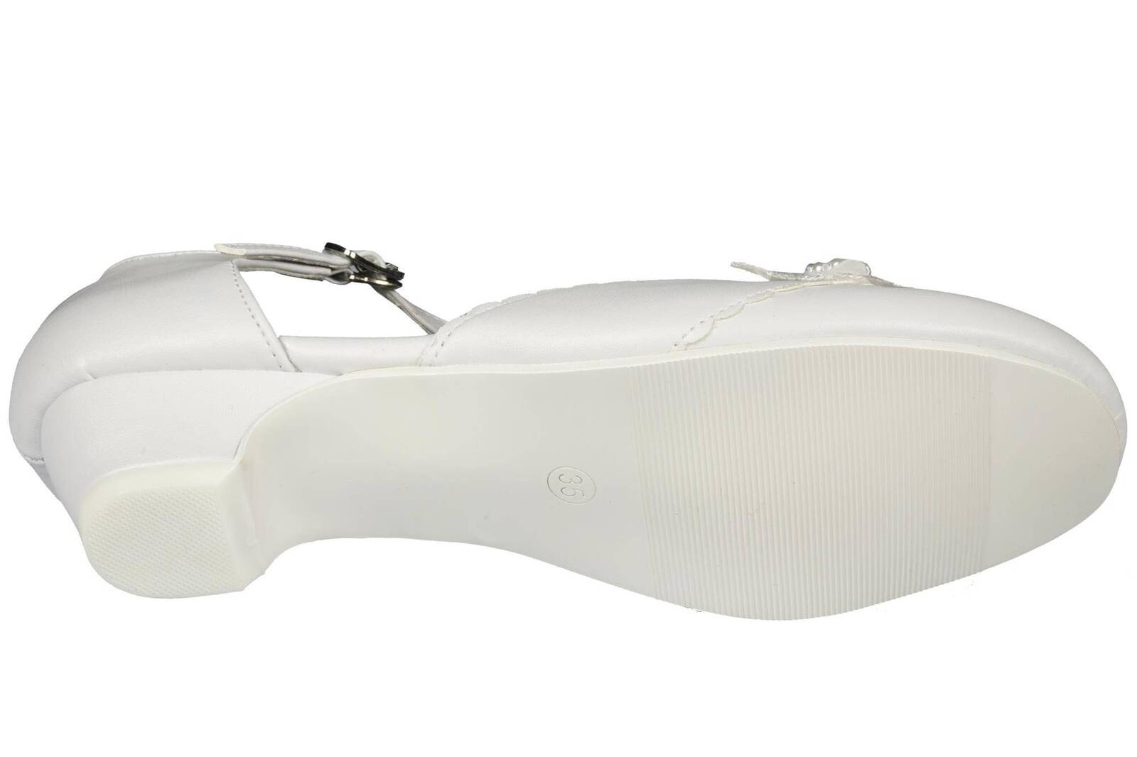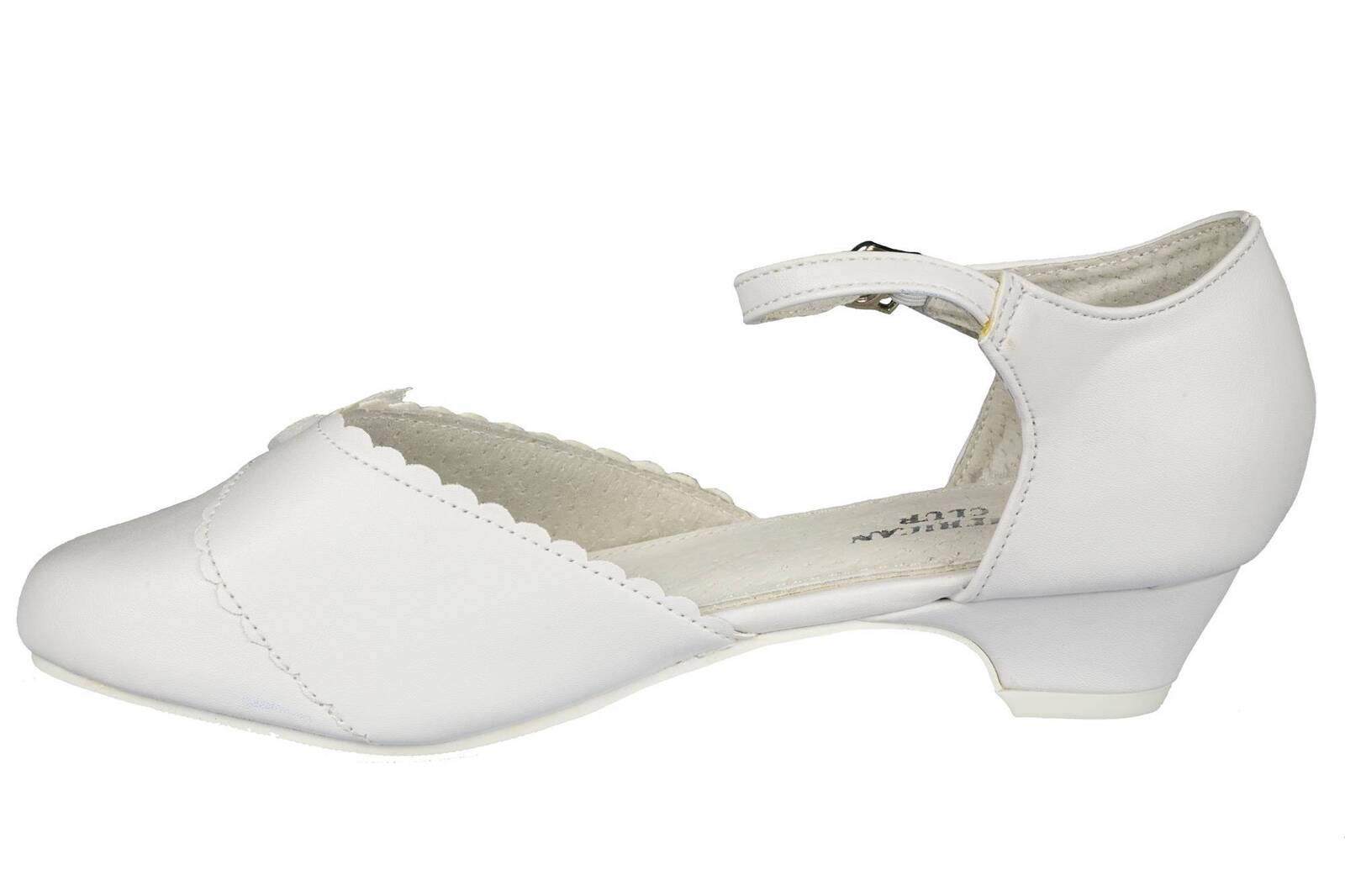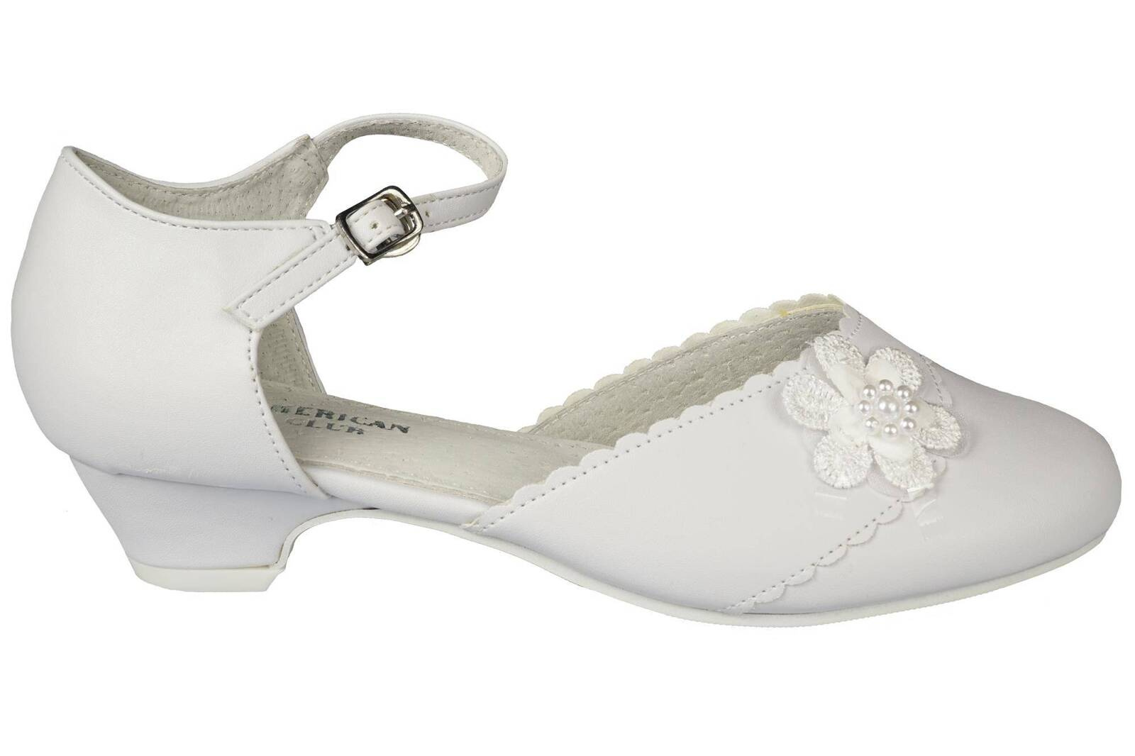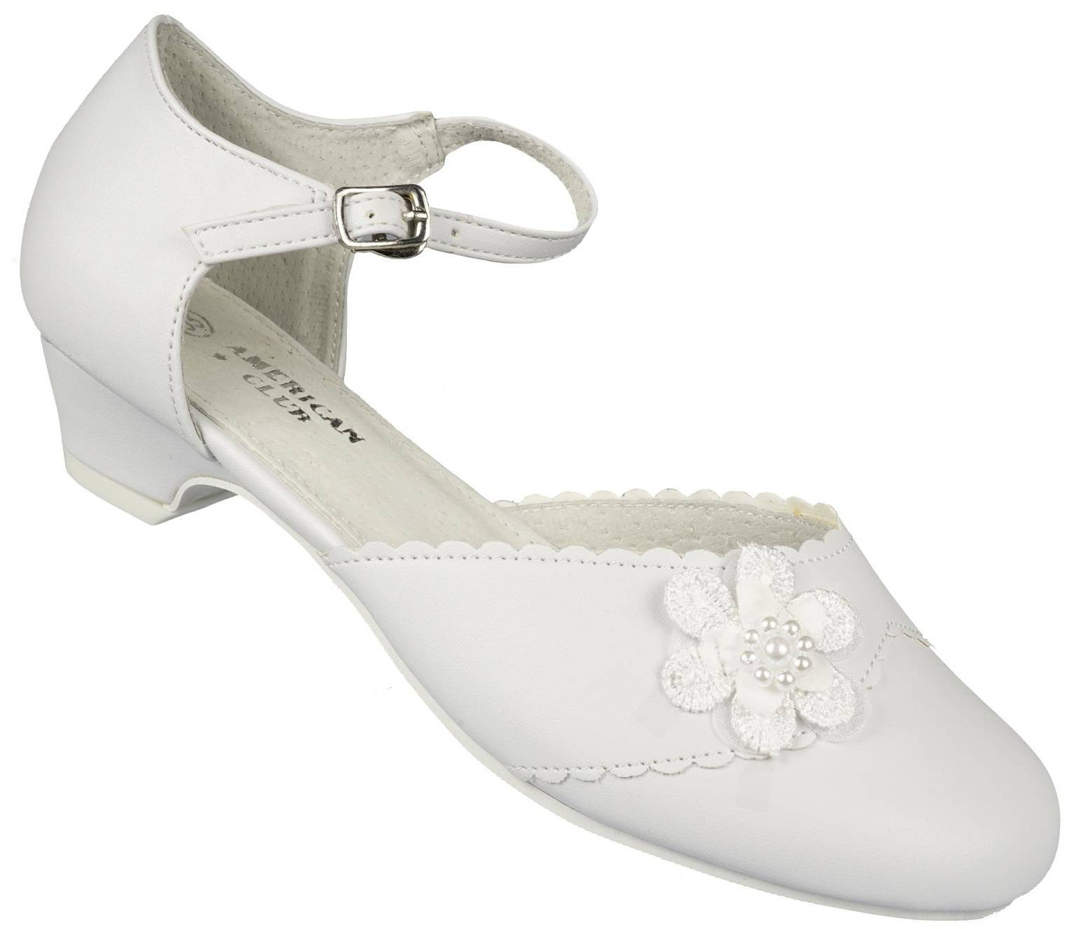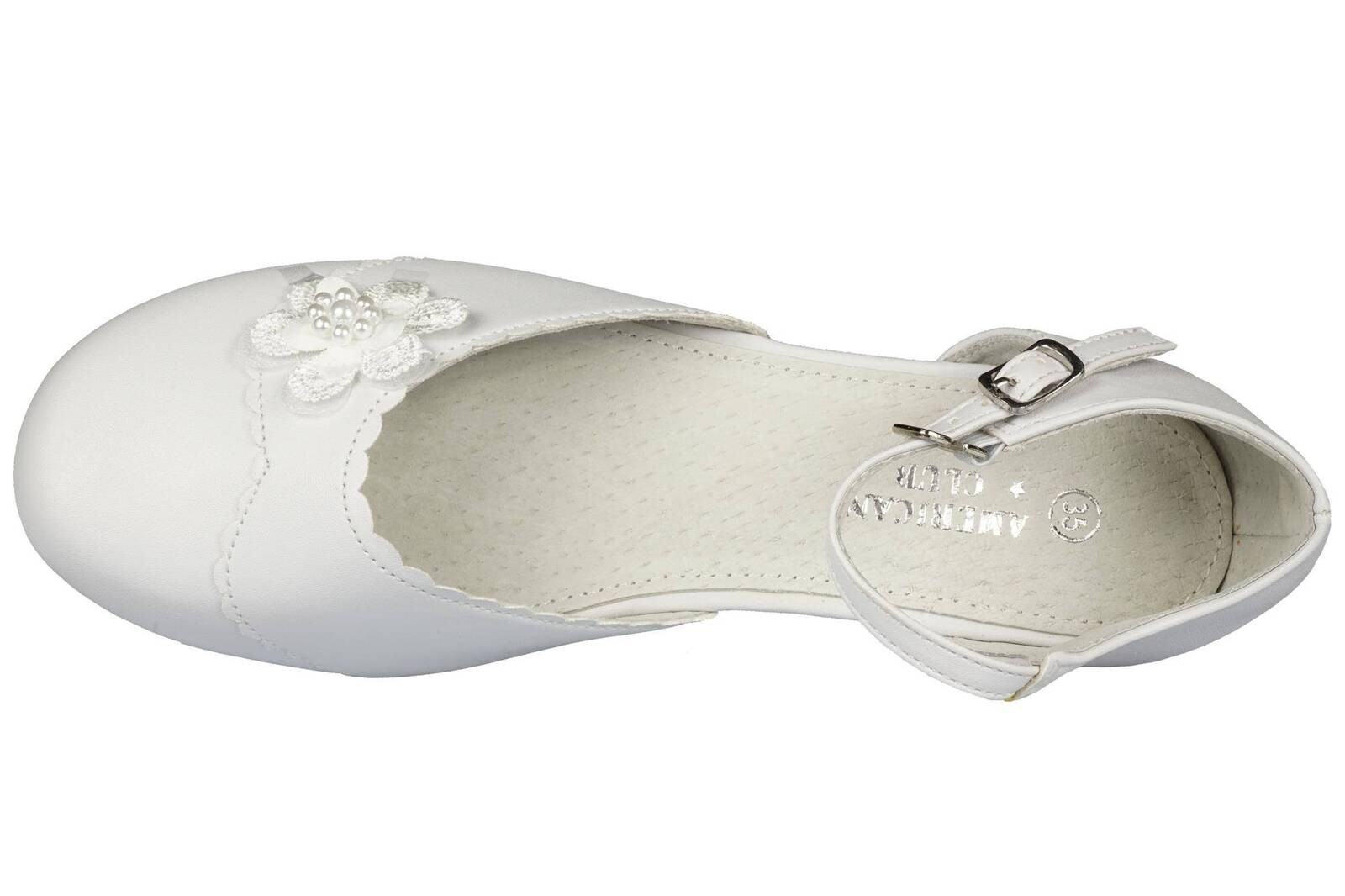 Eleganckie półbuty dziewczęce firmy American Club w klasycznym białym kolorze z ozdobami na przodzie. Wykonane zostały bardzo solidnie i starannie ze skóry ekologicznej. Posiadają obcas, który dodaje kilku centymetrów, a w połączeniu z wkładką skórzaną zapewnia wysoki komfort podczas użytkowania. Zapinane są na metalową klamerkę na pasku, dzięki temu można je idealnie dopasować do stopy. Idealnie sprawdzą się na specjalne okazje.