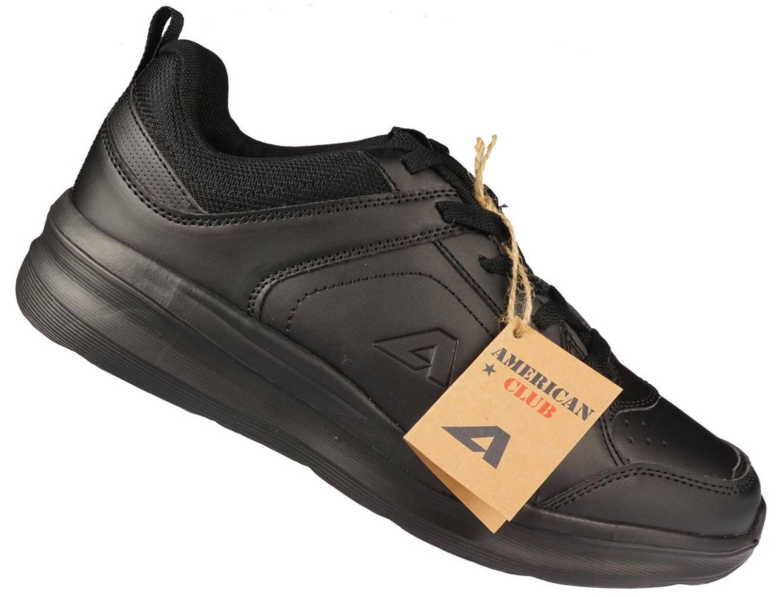 - Męskie buty sportowe Firmy American Club w kolorze czarnym. Posiadają dziurki na nosku, które zapewniają dobrą wentylację i zapobiegają poceniu się stopy. Obuwie jest wiązane, lekkie, posiada sztywny zapiętek co gwarantuje wygodę.