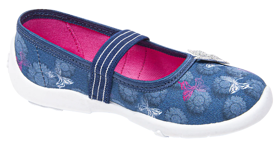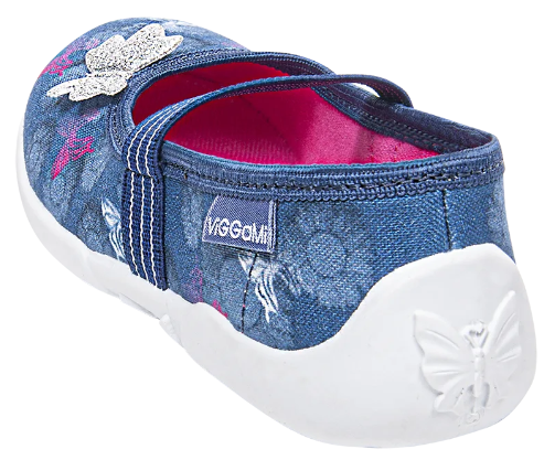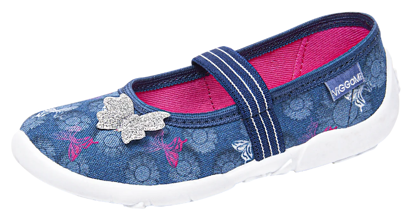 - Tenisówki dziecięce Viggami w granatowym kolorze z ciekawym wzorkiem i motylkiem. Kapcie są wsuwane co znacznie ułatwia samodzielne zakładanie obuwia przez dziecko. Posiadają certyfikat zdrowej stopy.