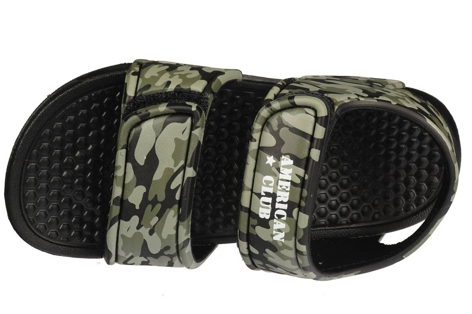 - Dziecięce klapki basenowe firmy American Club w kolorze zielonym. Wykonane zostały na wzór sandałów w bardzo ciekawym i ładnym stylu w całości z pianki, co sprawia że są one niesamowicie lekkie i wygodne. Wzór moro nadaje im chłopięcego charakteru.