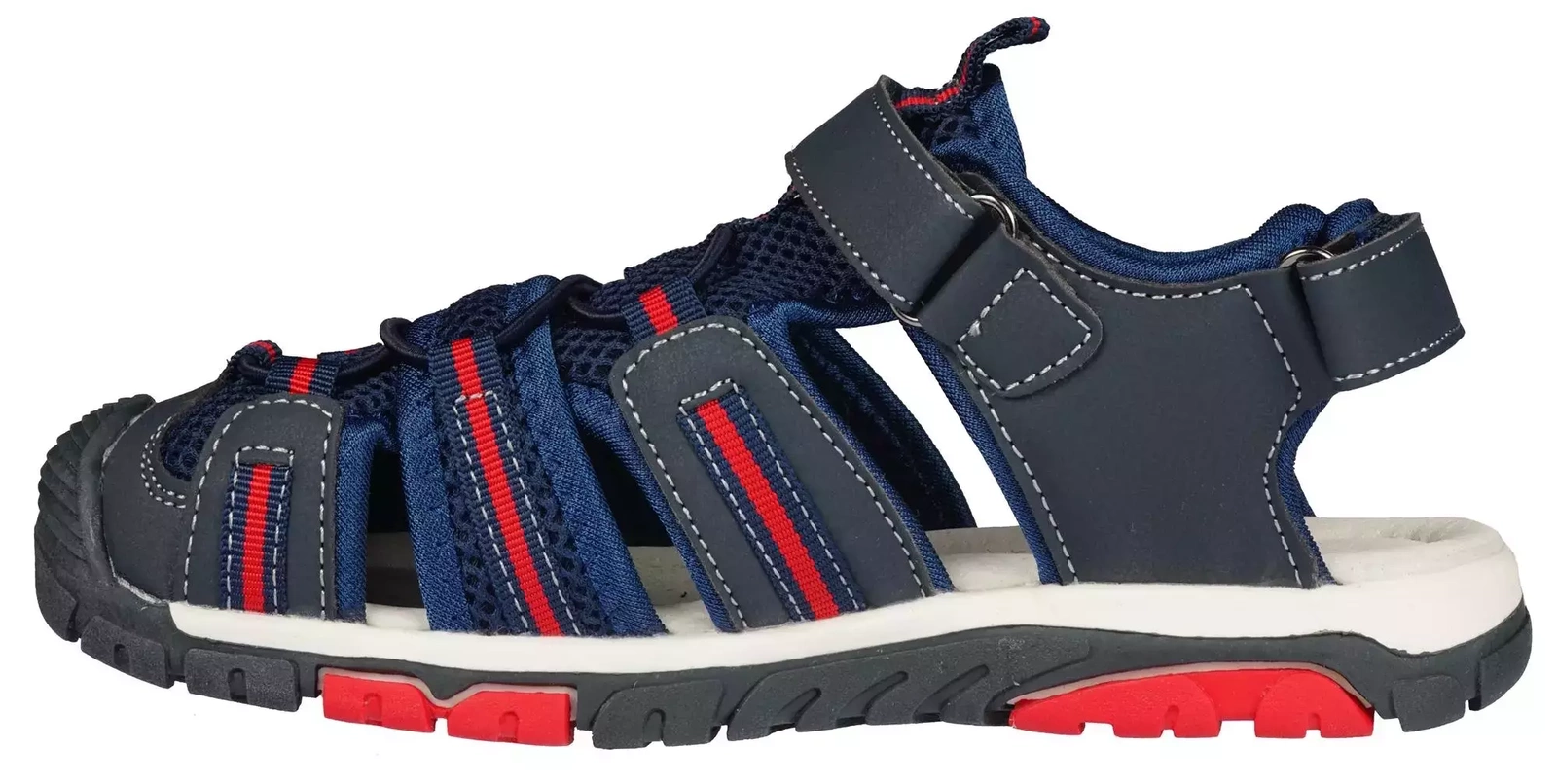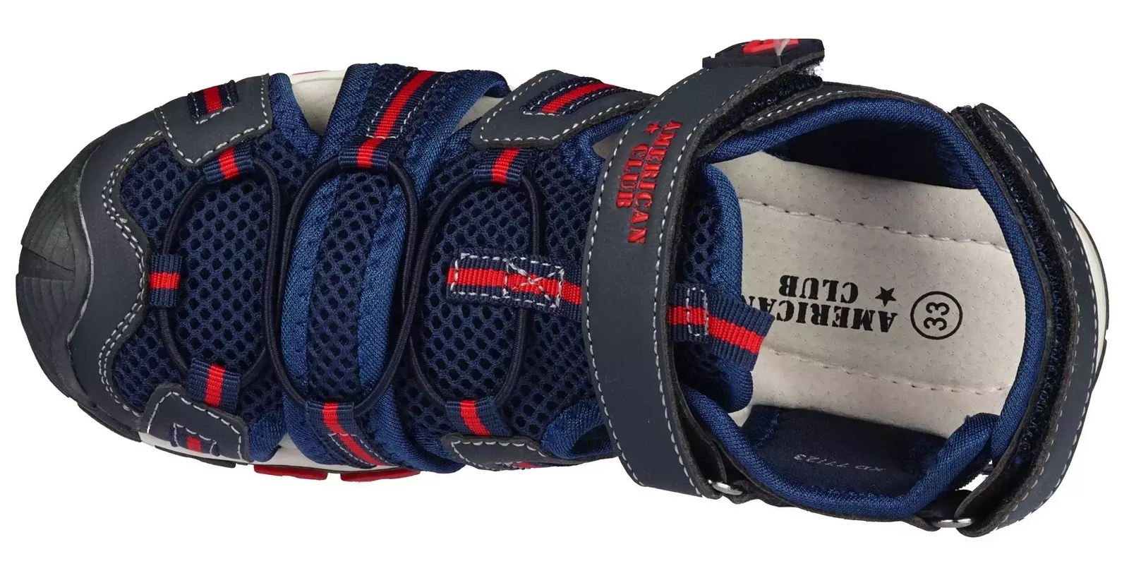 Dziecięce sandały firmy American Club w kolorze granatowym z czerwonymi elementami. Wykonane zostały w bardzo ciekawym, ładnym stylu i unikatowej konstrukcji. Wykorzystane do produkcji wysokiej jakości skóra ekologiczna i materiały tekstylne gwarantują wysoki komforty użytkowania i zapobiegają przed powstawaniem podrażnień i odcisków. Skórzana, profilowana wkładka dba o prawidłowy rozwój stopy dziecka, a zabudowany przód z gumowym noskiem ogranicza możliwość jej stłuczenia. Kolejną zaletą sandałów dziecięcych są dwie rzepy umieszczone na przodzie i na pięcie, które pozwalają na idealne dopasowanie oraz na łatwe samodzielne zapinanie przez dziecko. Dodatkowo, o odpowiedzenie dopasowanie obuwia dbają gumy ściągające, które dodatkowo zatrzymują stopę. Wysoka jakość materiałów w połączeniu z licznymi otworami i otwartą piętą gwarantują świetną wentylację, a gumowa podeszwa zapobiega ślizganiu. Prosta kolorystyka i ciekawa konstrukcja została dodatkowo uzupełniona odblaskowymi elementami, które zapewnią bezpieczeństwo podczas wieczornych wyjść. Każda z cech tego sandała dziecięcego składa się na to, że obuwie jest bezpieczne, wygodne i praktyczne. Model ten to doskonały wybór na lato do zabawy i użytku codziennego dla dziecka.