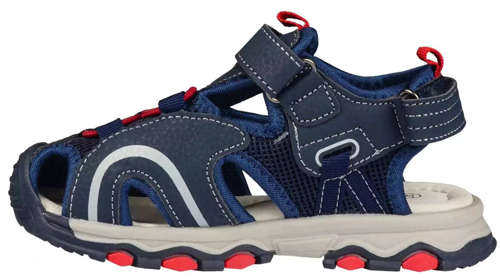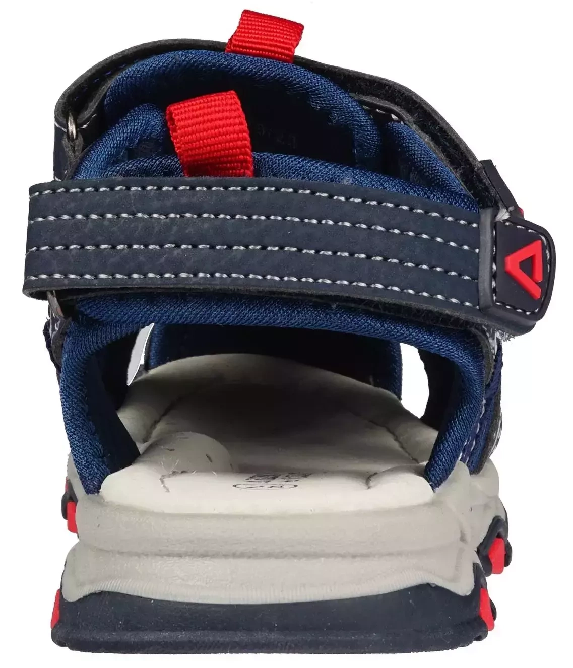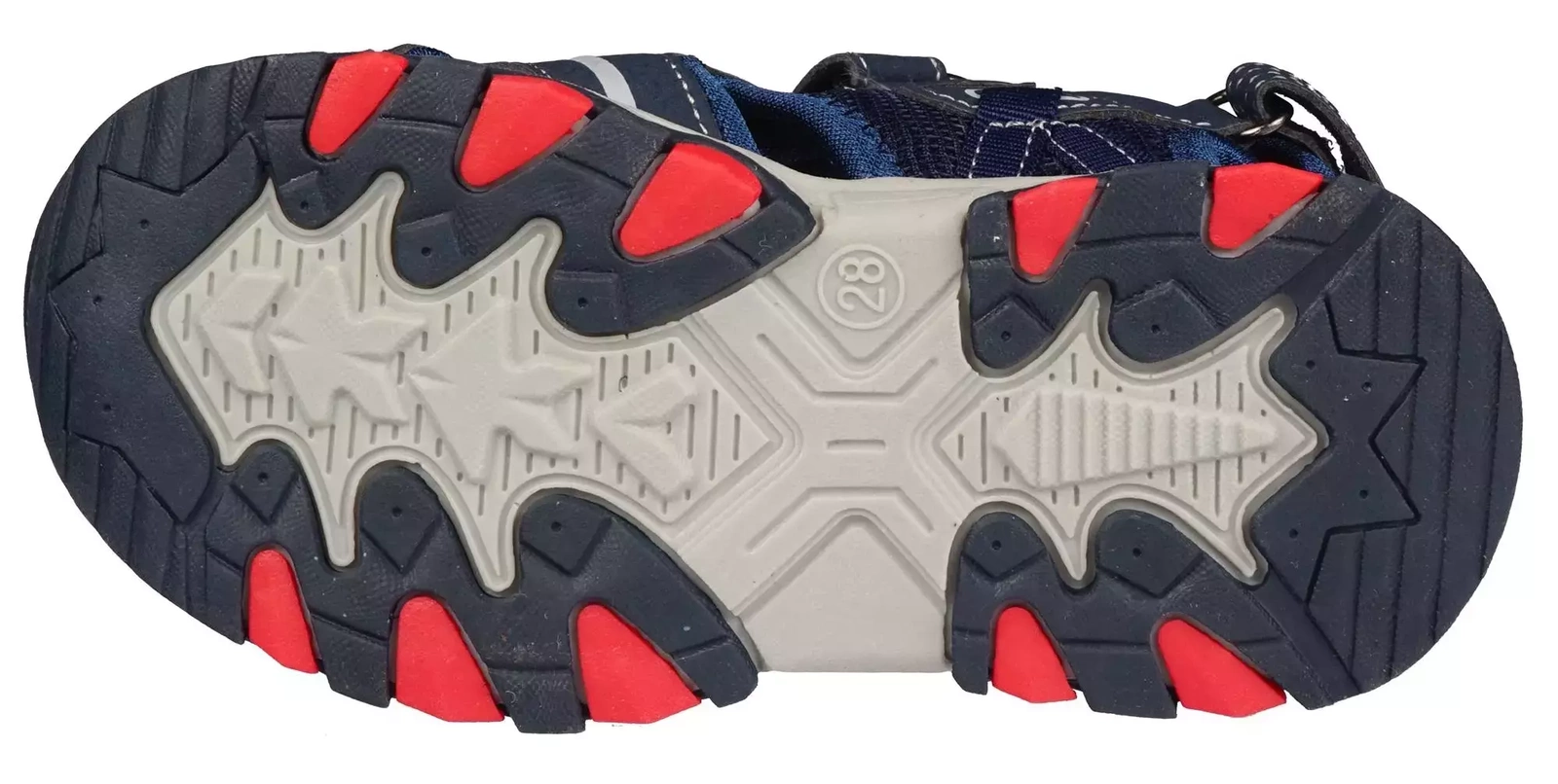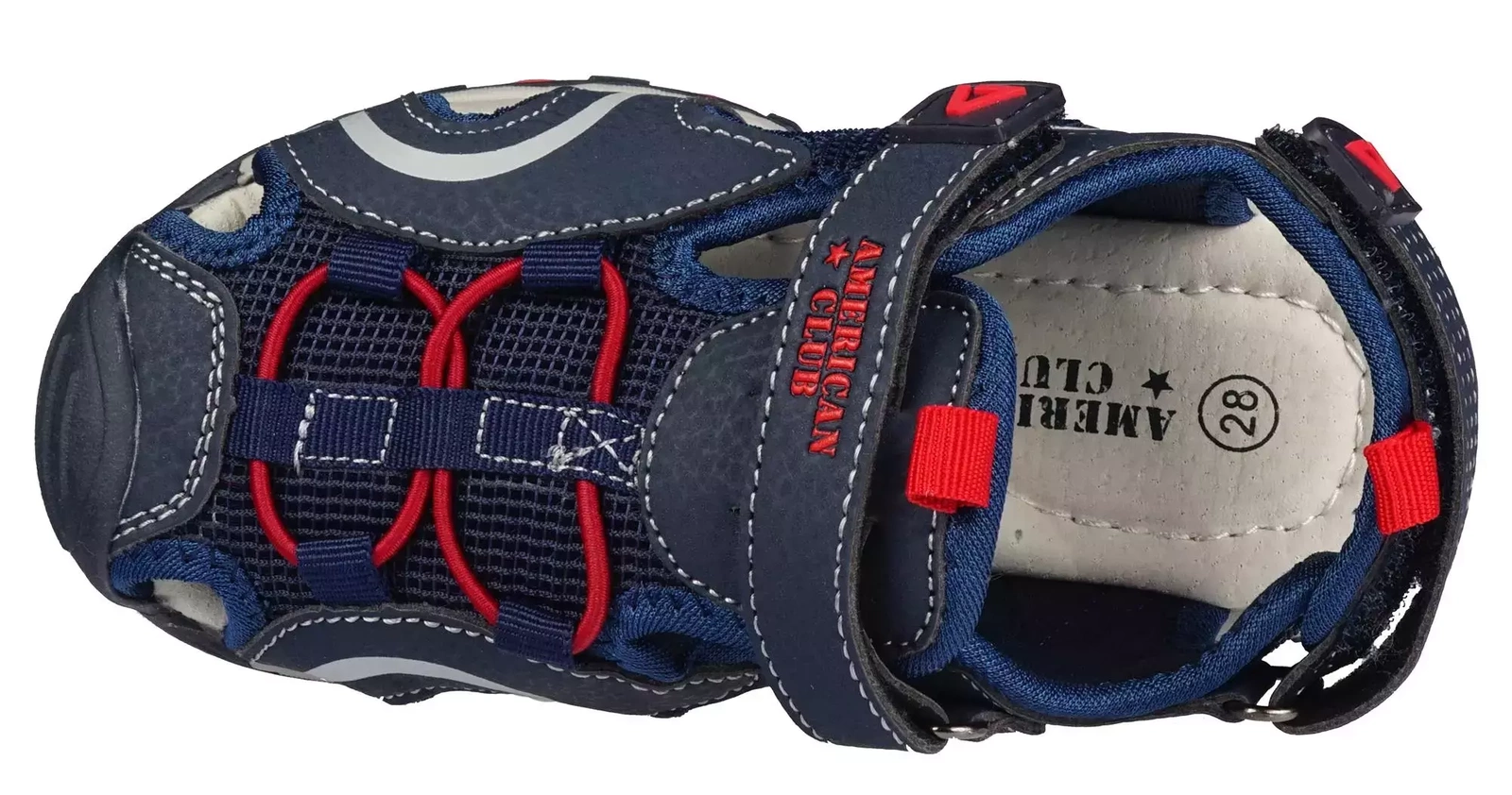 Dziecięce sandały firmy American Club w kolorze granatowym z czerwonymi i szarymi elementami. Wykonane zostały w bardzo ciekawym, ładnym stylu i unikatowej konstrukcji. Wykorzystane do produkcji wysokiej jakości skóra ekologiczna i materiały tekstylne gwarantują wysoki komforty użytkowania i zapobiegają przed powstawaniem podrażnień i odcisków. Skórzana, profilowana wkładka dba o prawidłowy rozwój stopy dziecka, a zabudowany przód z gumowym noskiem ogranicza możliwość jej stłuczenia. Kolejną zaletą sandałów dziecięcych są dwie rzepy umieszczone na przodzie i na pięcie, które pozwalają na idealne dopasowanie oraz na łatwe samodzielne zapinanie przez dziecko. Dodatkowo, o odpowiedzenie dopasowanie obuwia dbają gumy ściągające, które dodatkowo zatrzymują stopę. Wysoka jakość materiałów w połączeniu z licznymi otworami i otwartą piętą gwarantują świetną wentylację, a gumowa podeszwa zapobiega ślizganiu. Prosta kolorystyka i ciekawa konstrukcja została dodatkowo uzupełniona odblaskowymi elementami, które zapewnią bezpieczeństwo podczas wieczornych wyjść. Każda z cech tego sandała dziecięcego składa się na to, że obuwie jest bezpieczne, wygodne i praktyczne. Model ten to doskonały wybór na lato do zabawy i użytku codziennego dla dziecka.