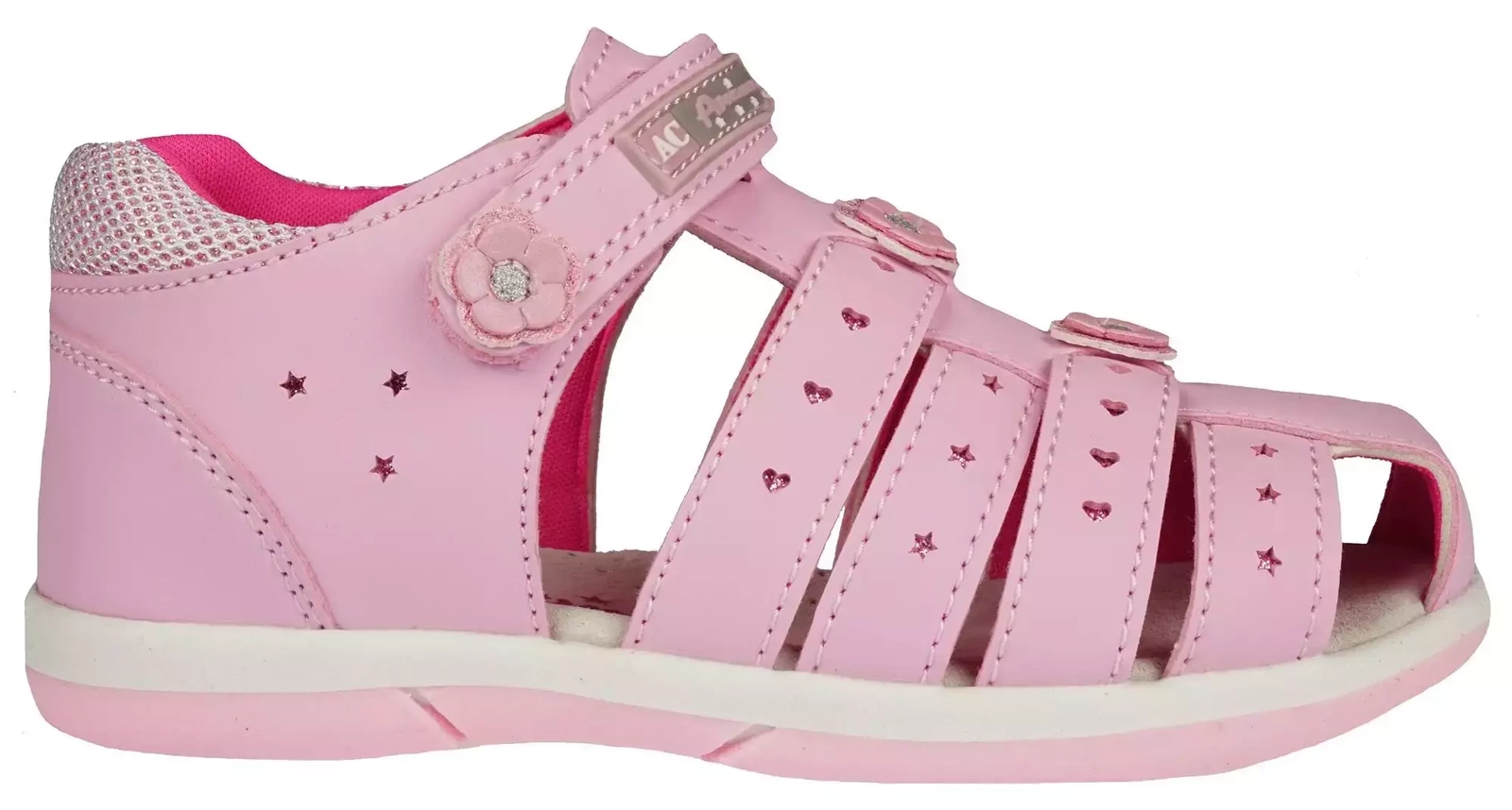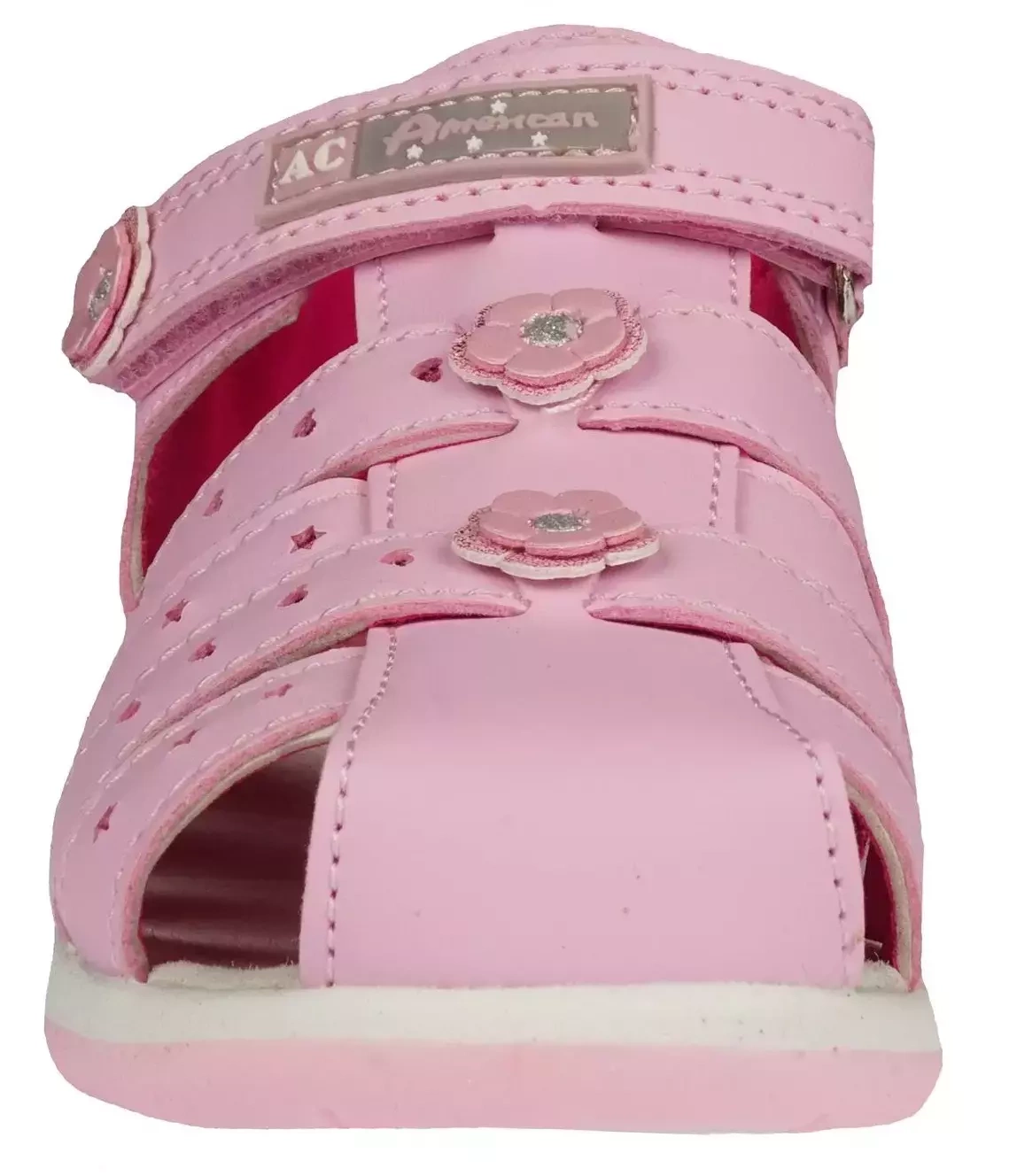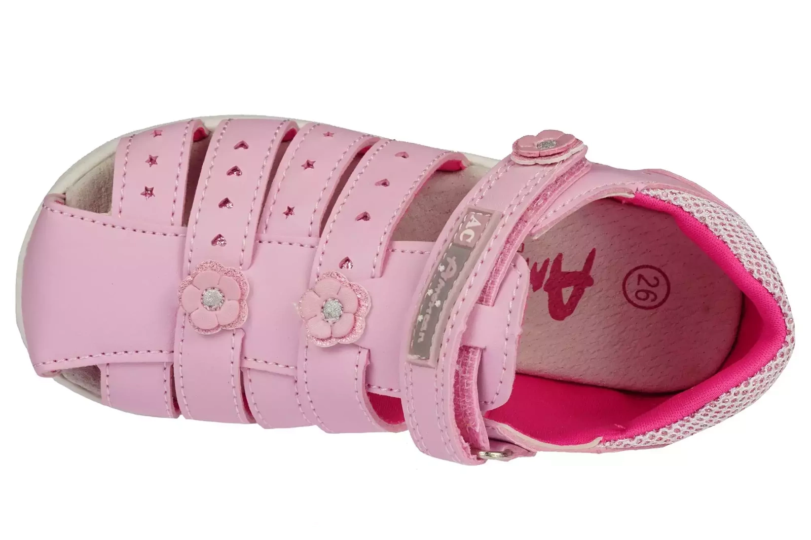 - Sandały dziecięce American Club w różowym kolorze z ozdobnymi kwiatami. Stworzone zostały z wysokiej jakości skóry ekologicznej. Posiadają wkładkę ze skóry naturalnej co podnosi komfort podczas użytkowania co pozwala na prawidłowy rozwój stopy.