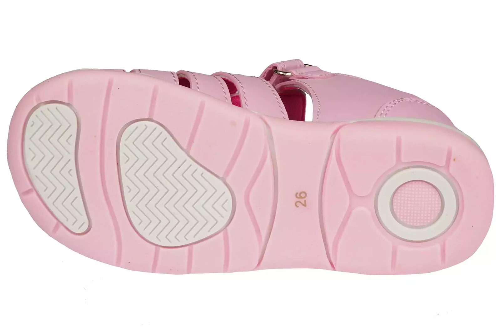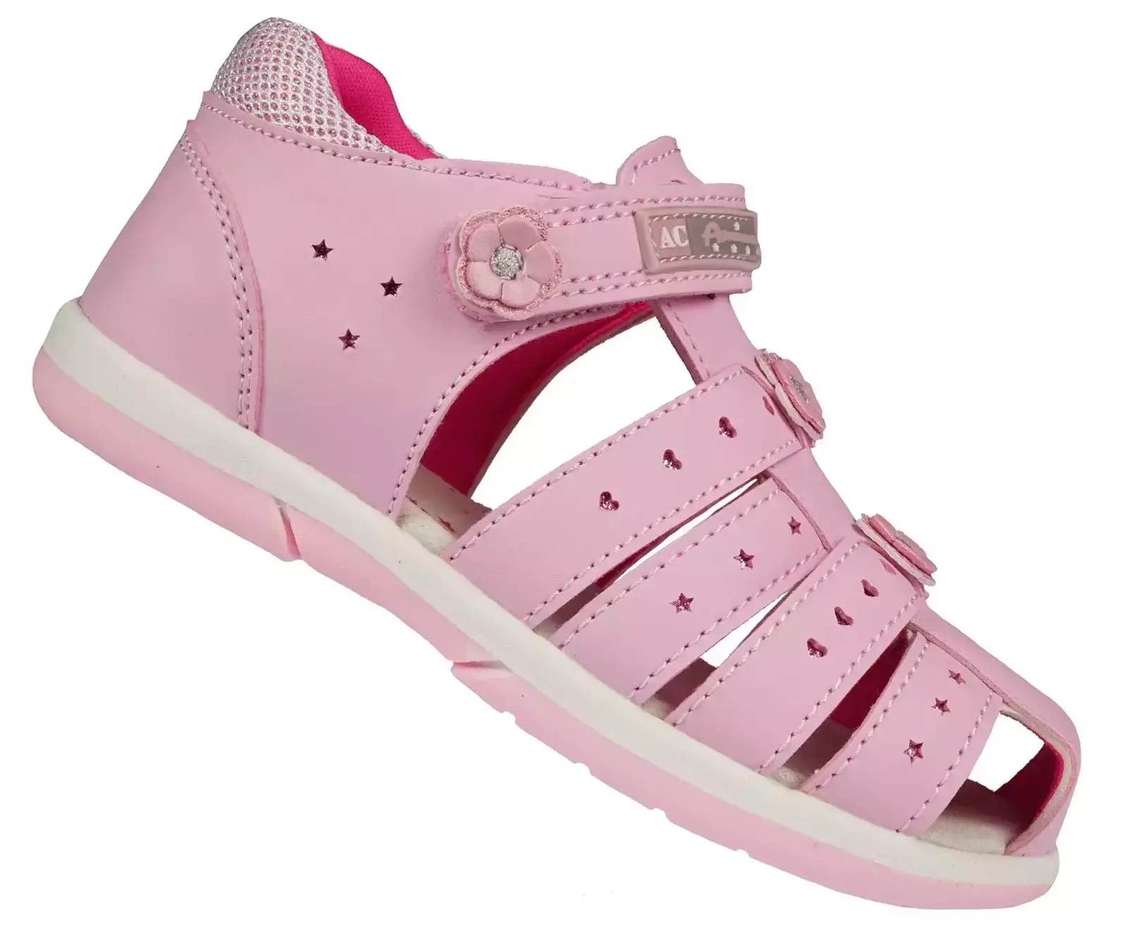 Sandały dziecięce American Club w różowym kolorze z ozdobnymi kwiatami. Stworzone zostały z wysokiej jakości skóry ekologicznej, która zapobiega powstawaniu podrażnień. Wewnątrz wyposażone zostały we wkładkę ze skóry naturalnej co podnosi komfort podczas użytkowania oraz pozwala na prawidłowy rozwój stopy dziecka. Obuwie zapinane na rzepy co zapewnia idealne dopasowanie do stopy, ułatwia to też samodzielne zakładanie przez dzieci. Gumowe podeszwy odpowiadają za bezpieczeństwo zapobiegając ślizganiu się. Buty są mega przewiewne i mają zabudowany przód który zabezpiecza palce przed otarciami. Model ten będzie idealny do codziennego użytku w sezonie leniem. Sandały posiadają zabudowaną i wzmocnioną piętę.