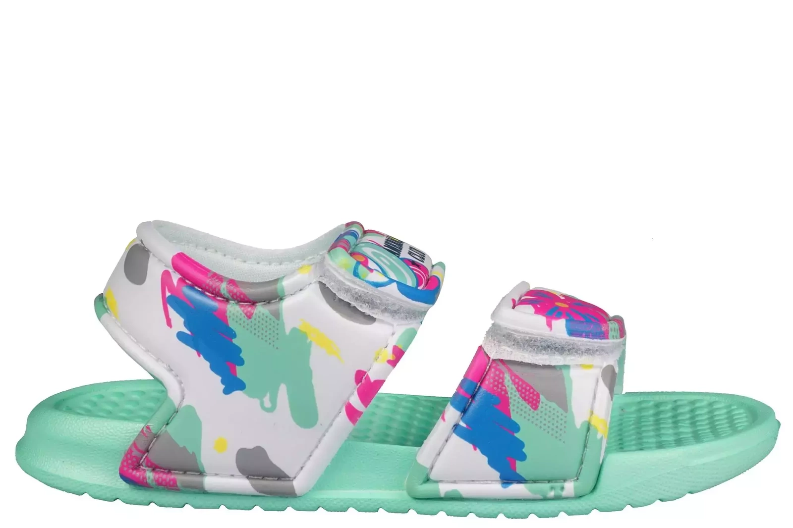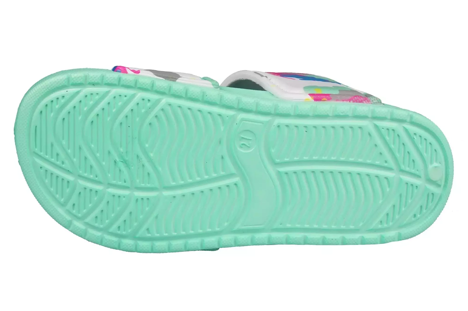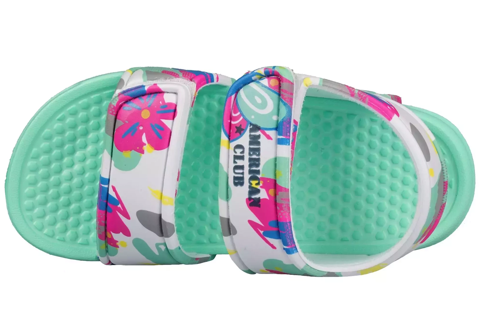 - Dziecięce klapki basenowe firmy American Club w kolorze turkusowym. Wykonane na wzór sandałów w bardzo ciekawym i ładnym stylu w całości z pianki, co sprawia że są one niesamowicie lekkie i wygodne. Zapięcie na rzep zapewnia mega dopasowanie do stopy.