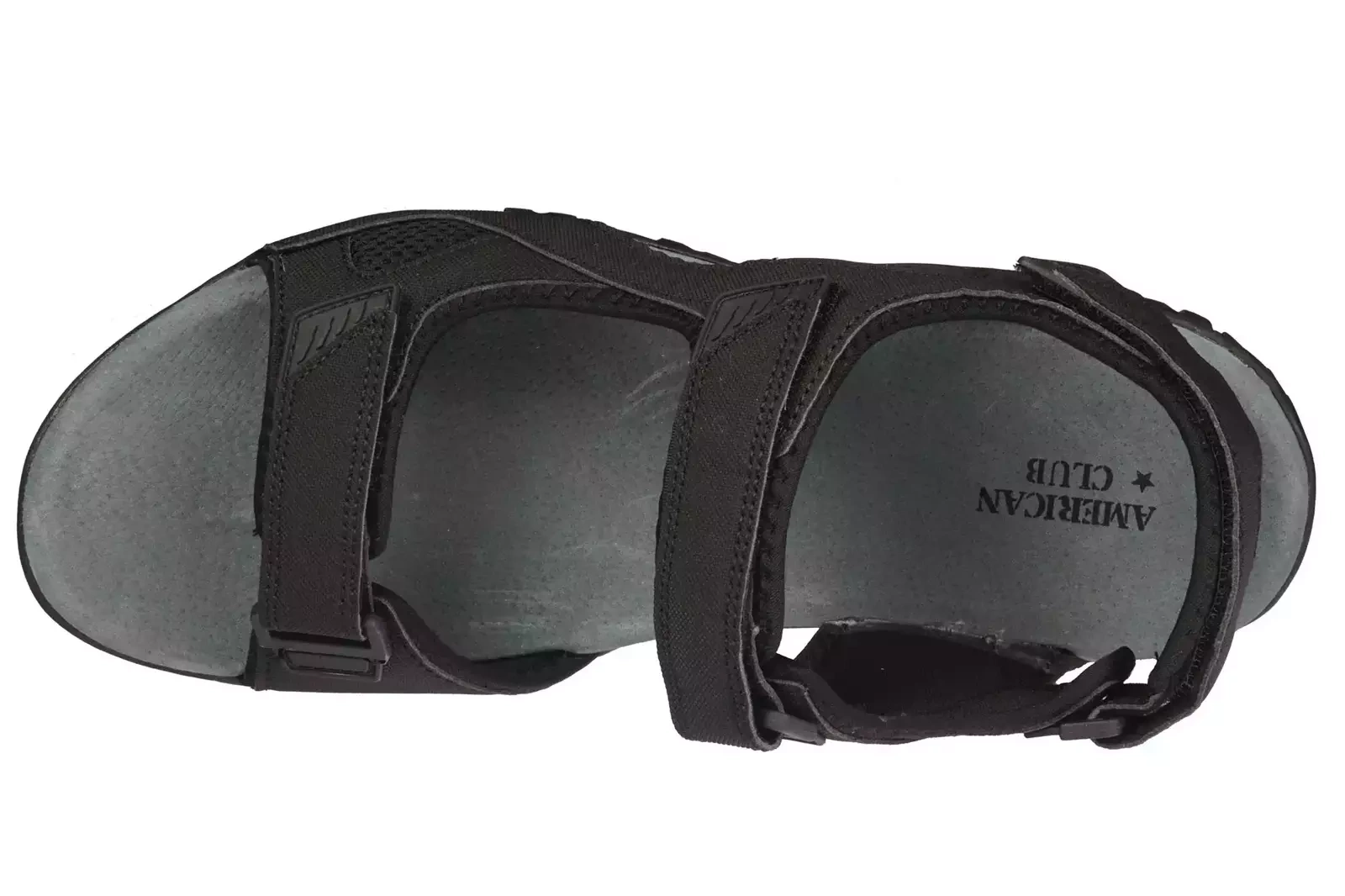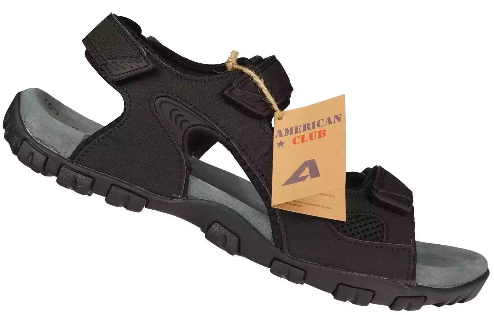 - Sandały męskie firmy American Club w kolorze czarnym zapinane na rzep. Miękka, skórzana wkładka, odpowiada za komfort i prawidłowe ułożenie stopy podczas chodzenia oraz zapobiega nadmiernemu poceniu się. Gumowe podeszwy zagwarantują stabilność.