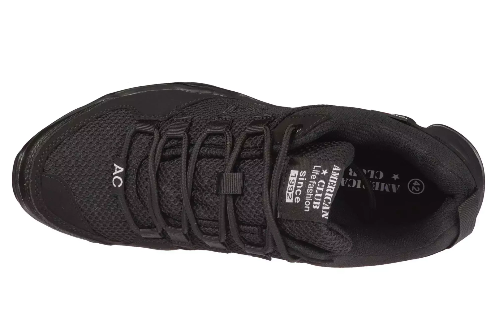 • Męskie buty sportowe Firmy American Club w kolorze czarnym. Posiadają siateczkę na przodzie, która zapewnia dobrą wentylację i zapobiega poceniu się stopy. Obuwie jest wiązane, lekkie, posiada sztywny zapiętek co gwarantuje wygodę.