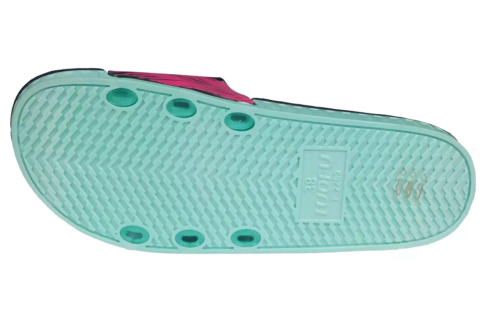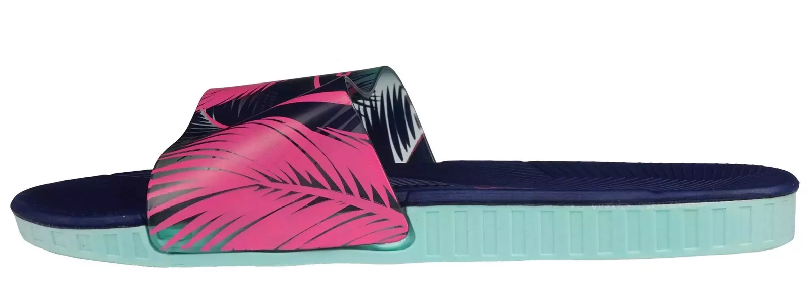 - Młodzieżowe klapki basenowe wykonane z pianki w granatowym kolorze z ozdobnym wzorkiem w palmy. Sprawdzą się idealnie na basen, wakacje czy do codziennego użytku. Klapki są miękkie, elastyczne i wygodne.