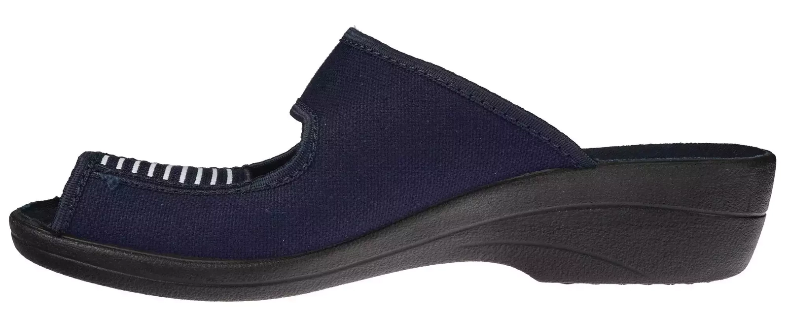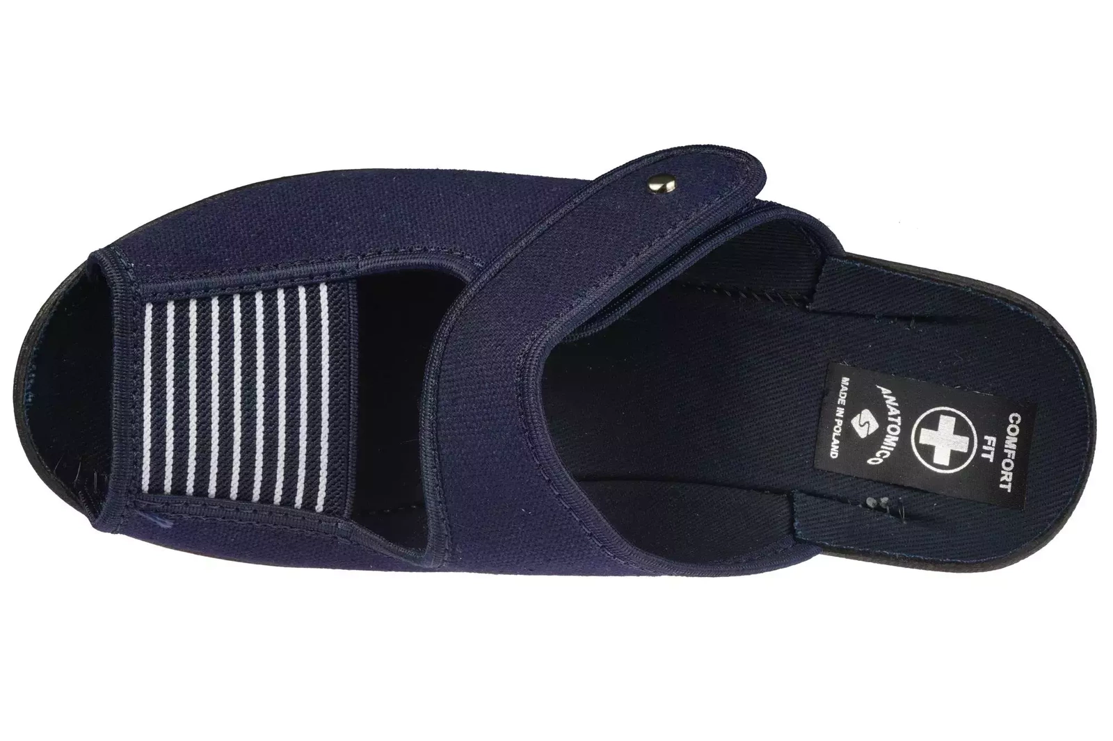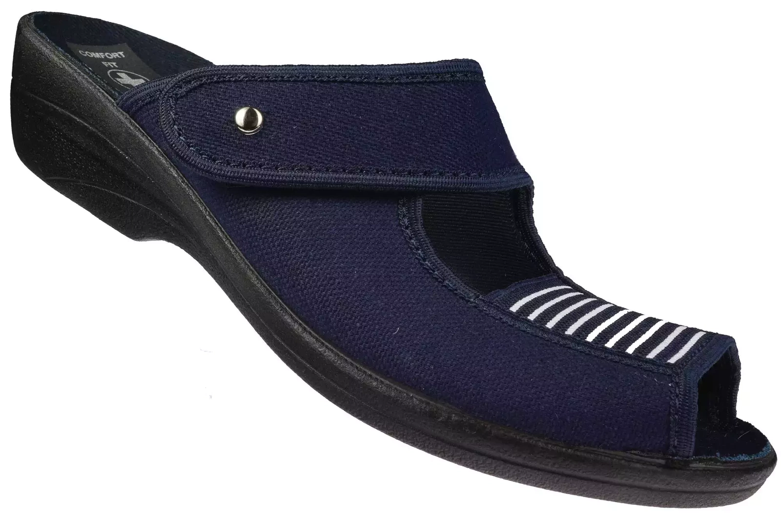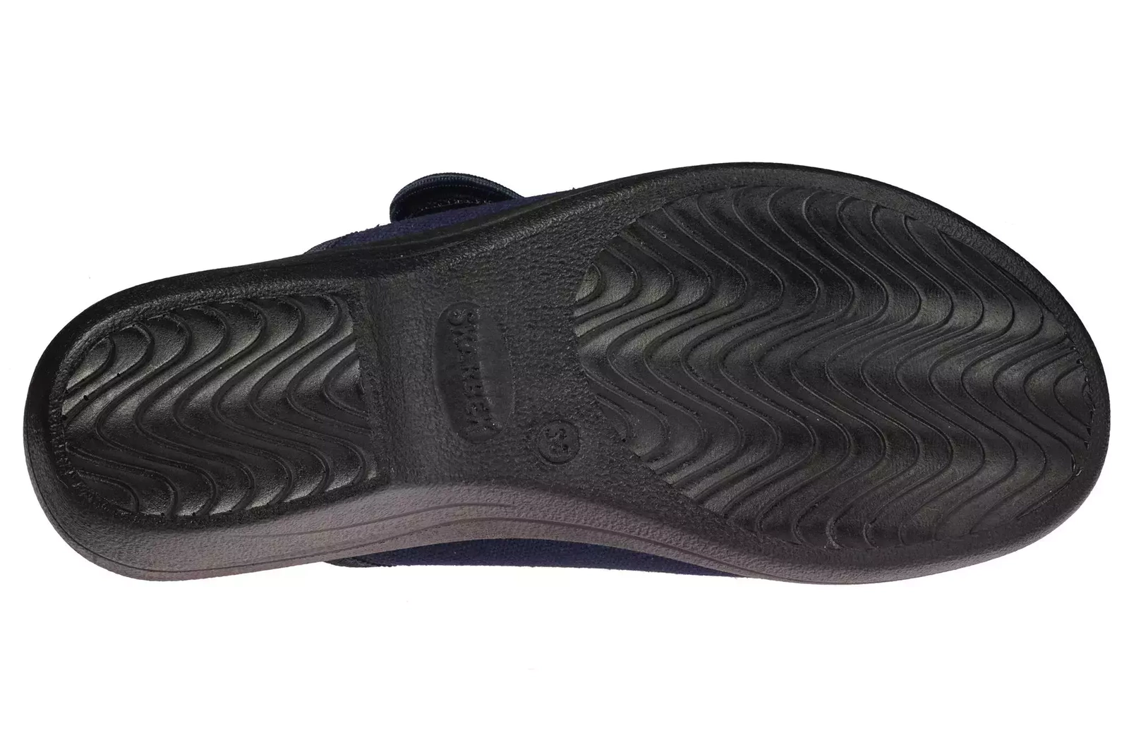 - Pantofle tekstylne damskie firmy Skarbek w kolorze granatowym. Solidne wykonanie z dobrej jakości materiałów zagwarantuje ci wygodę. Posiadają otwarty nosek, który zapewnia świetną wentylacje. Osadzone na niskim klockowym obcasie.