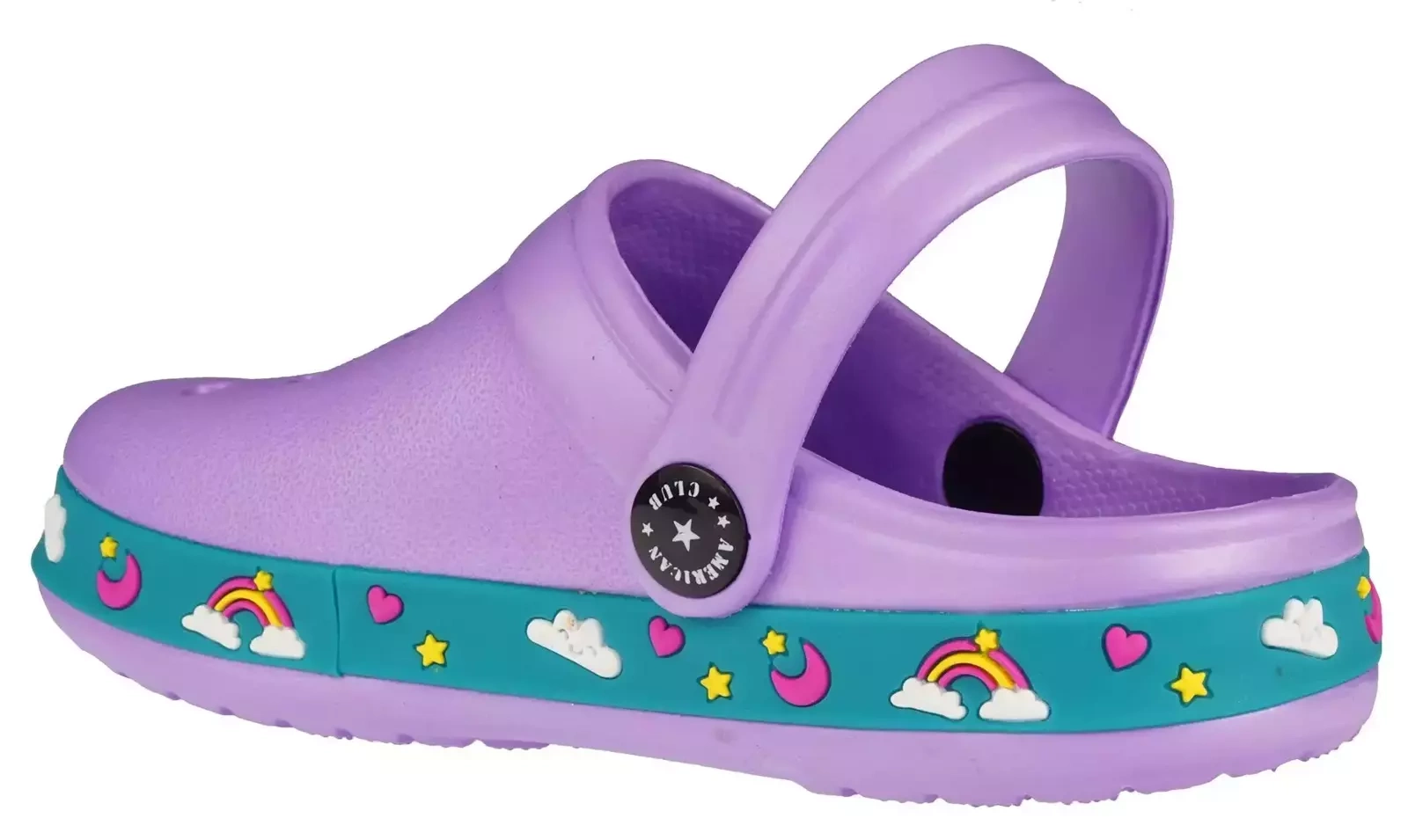 Dziecięce klapki basenowe firmy American Club w kolorze fioletowym. Wykonane w bardzo ciekawym i ładnym stylu w całości z pianki, co sprawia że są one niesamowicie lekkie wygodne i przyjazne dla skóry. Model ten to doskonały wybór obuwia letniego do zabawy na plaży lub do użytku codziennego. Ich piankowa, bieżnikowana podeszwa zapewni stabilność i zapobiegnie ślizganiu. Model ten wyposażony został w pasek, który trzyma piętę. Dziurki na całej powierzchni zapewniają odpowiednią wentylacje stopie a antypoślizgowa podeszwa gwarantuje bezpieczeństwo.