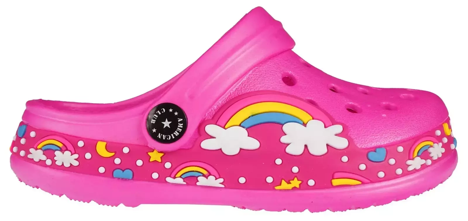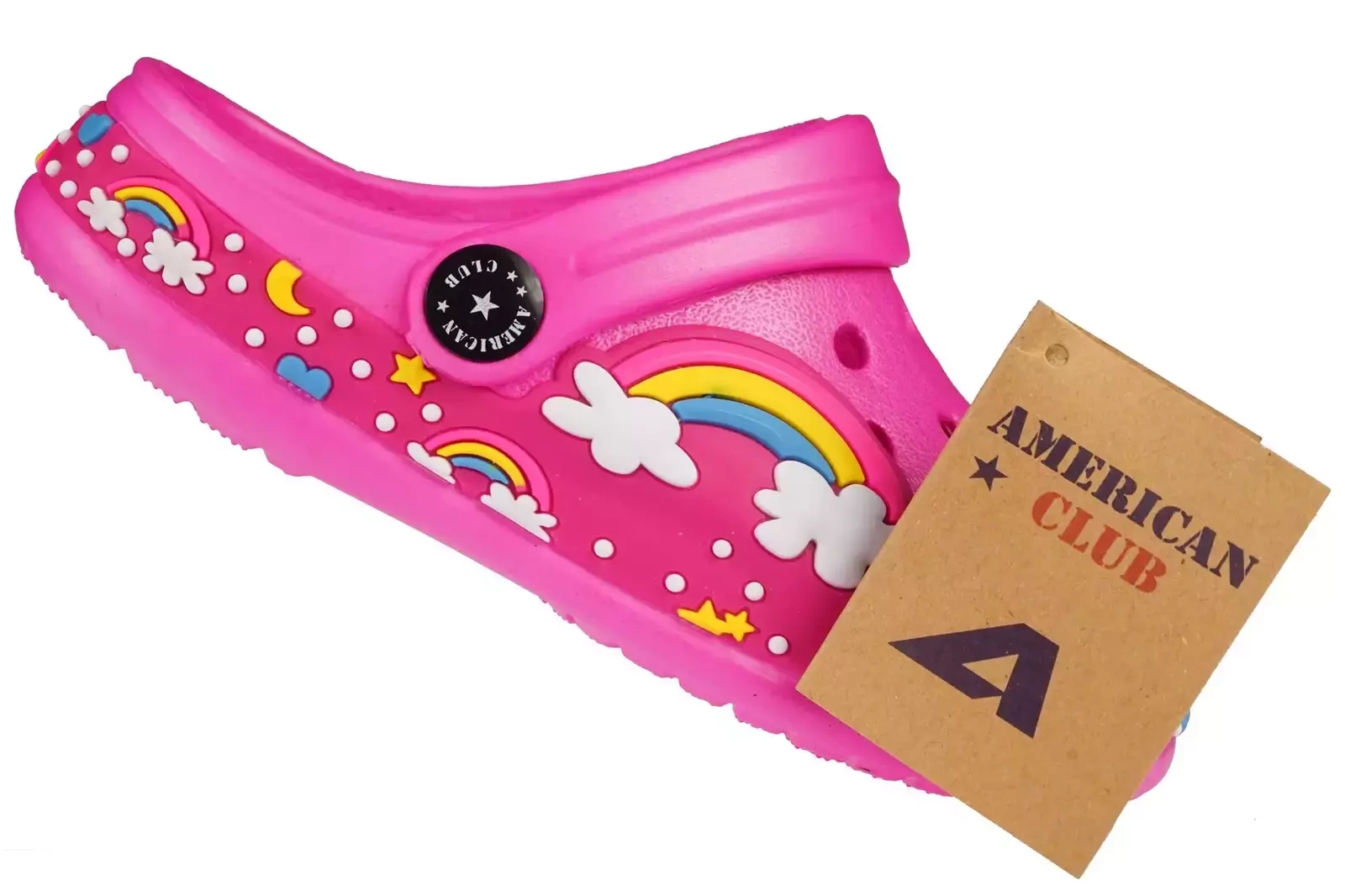 Dziecięce klapki basenowe firmy American Club w kolorze różowym. Wykonane w bardzo ciekawym i ładnym stylu w całości z pianki, co sprawia że są one niesamowicie lekkie wygodne i przyjazne dla skóry. Model ten to doskonały wybór obuwia letniego do zabawy na plaży lub do użytku codziennego. Ich piankowa, bieżnikowana podeszwa zapewni stabilność i zapobiegnie ślizganiu. Model ten wyposażony został w pasek, który trzyma piętę. Dziurki na całej powierzchni zapewniają odpowiednią wentylacje stopie a antypoślizgowa podeszwa gwarantuje bezpieczeństwo.