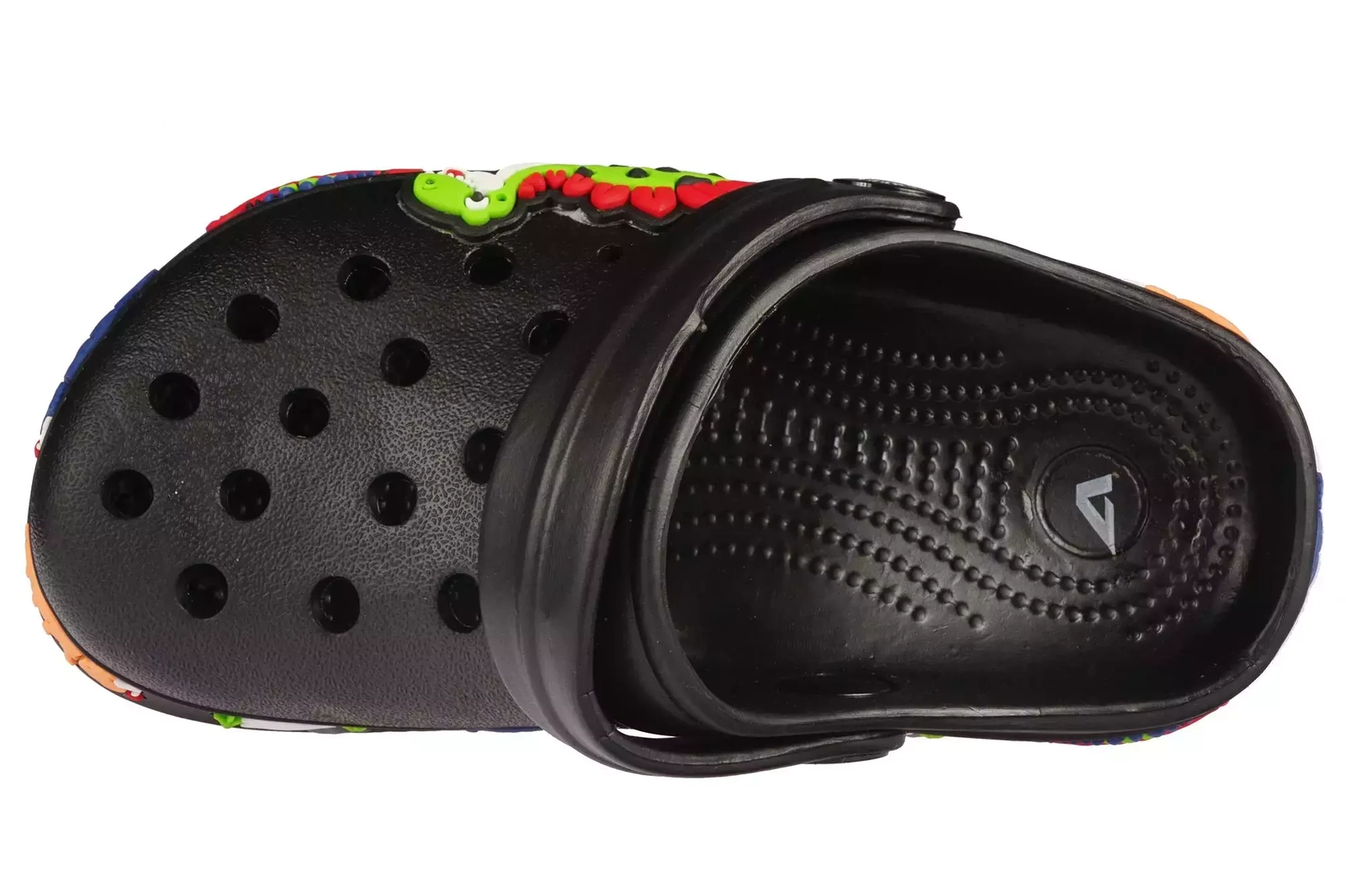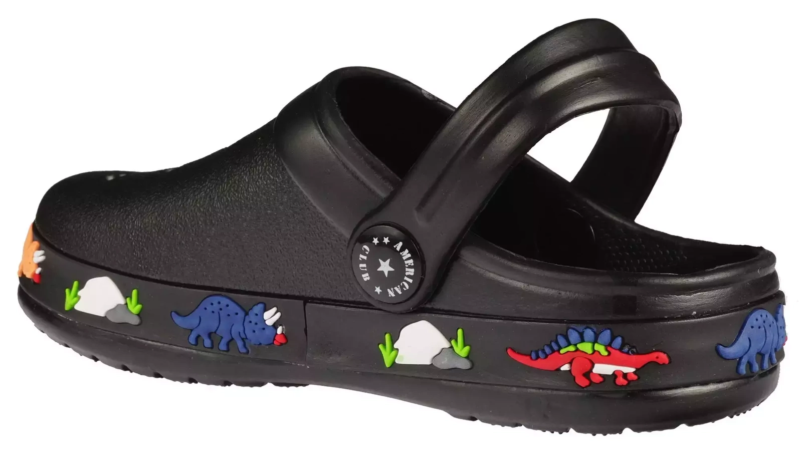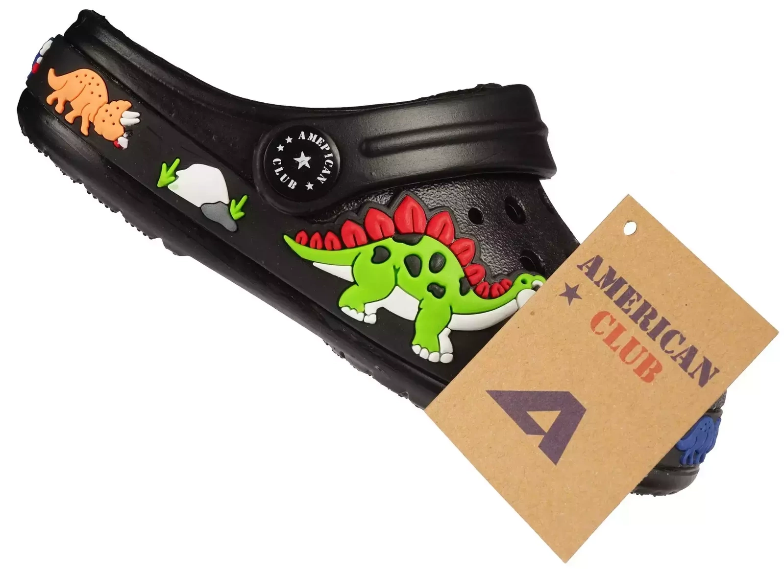 Dziecięce klapki basenowe firmy American Club w kolorze czarnym. Wykonane w bardzo ciekawym i ładnym stylu w całości z pianki, co sprawia że są one niesamowicie lekkie wygodne i przyjazne dla skóry. Model ten to doskonały wybór obuwia letniego do zabawy na plaży lub do użytku codziennego. Ich piankowa, bieżnikowana podeszwa zapewni stabilność i zapobiegnie ślizganiu. Model ten wyposażony został w pasek, który trzyma piętę. Dziurki na całej powierzchni zapewniają odpowiednią wentylacje stopie a antypoślizgowa podeszwa gwarantuje bezpieczeństwo.