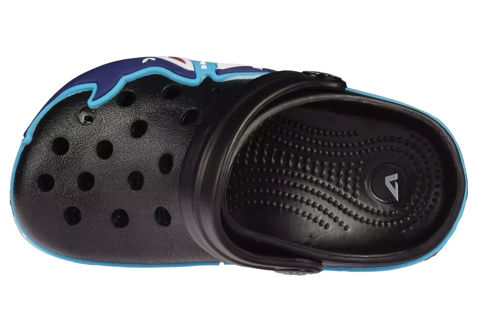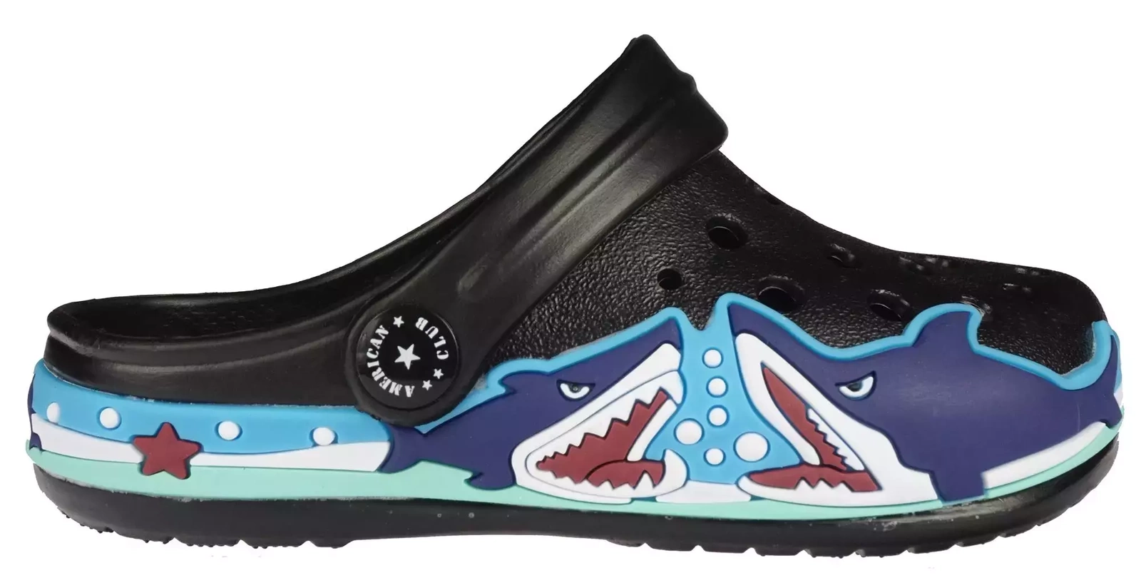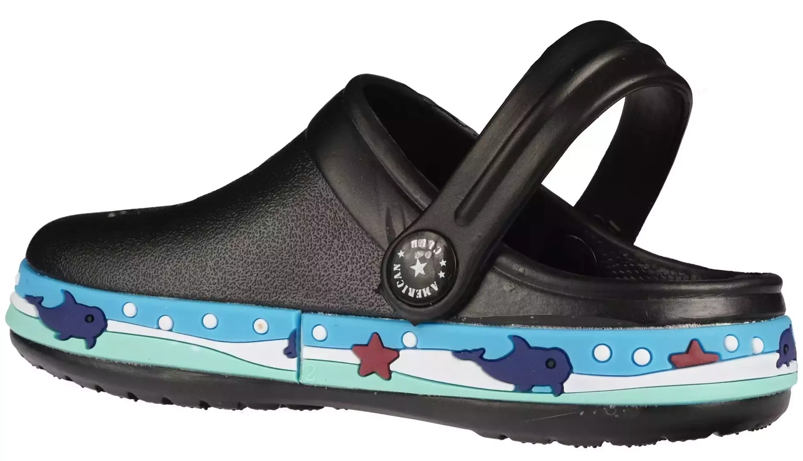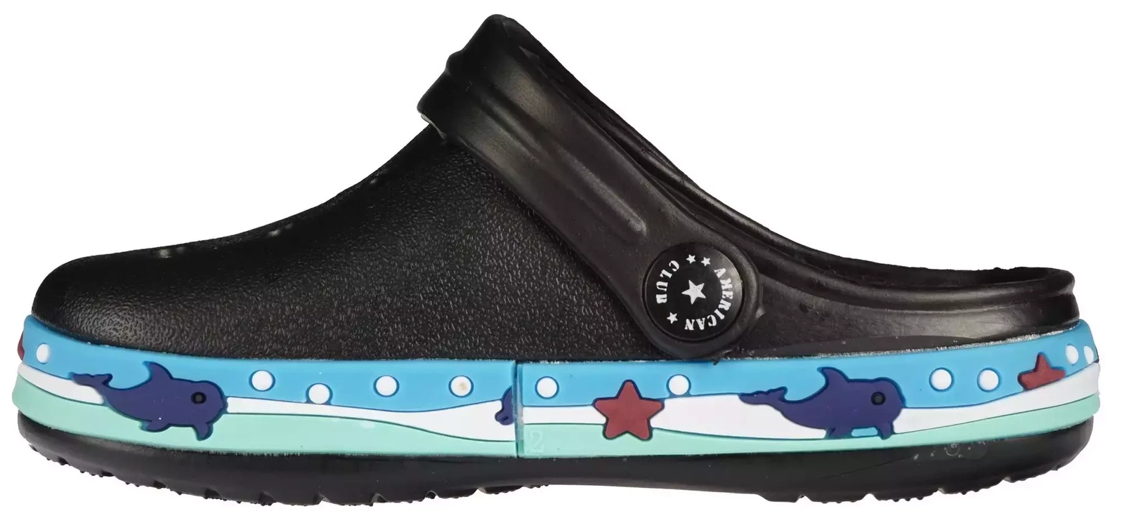 Dziecięce klapki basenowe firmy American Club w kolorze czarnym. Wykonane w bardzo ciekawym i ładnym stylu w całości z pianki, co sprawia że są one niesamowicie lekkie wygodne i przyjazne dla skóry. Model ten to doskonały wybór obuwia letniego do zabawy na plaży lub do użytku codziennego. Ich piankowa, bieżnikowana podeszwa zapewni stabilność i zapobiegnie ślizganiu. Model ten wyposażony został w pasek, który trzyma piętę. Dziurki na całej powierzchni zapewniają odpowiednią wentylacje stopie a antypoślizgowa podeszwa gwarantuje bezpieczeństwo.