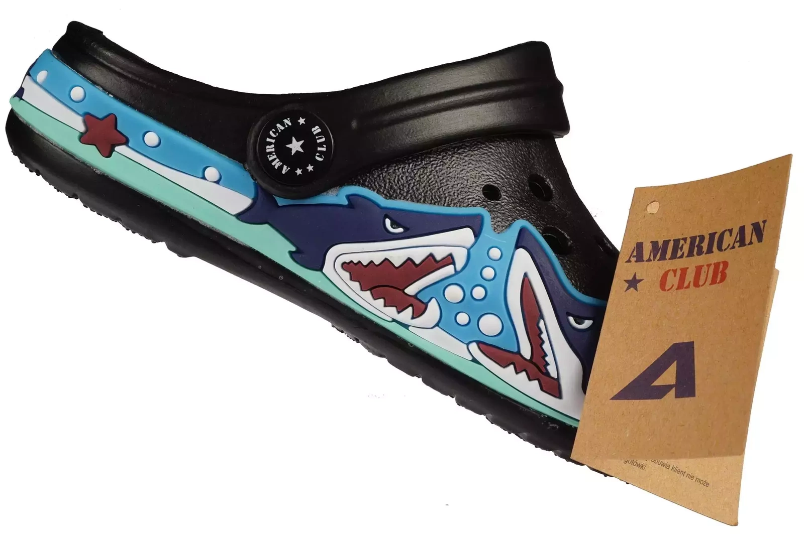 - Dziecięce klapki basenowe firmy American Club w kolorze czarnym. Wykonane w bardzo ciekawym i ładnym stylu w całości z pianki, co sprawia że są one niesamowicie lekkie i wygodne. Model ten wyposażony został w pasek, który trzyma piętę.