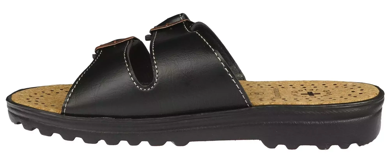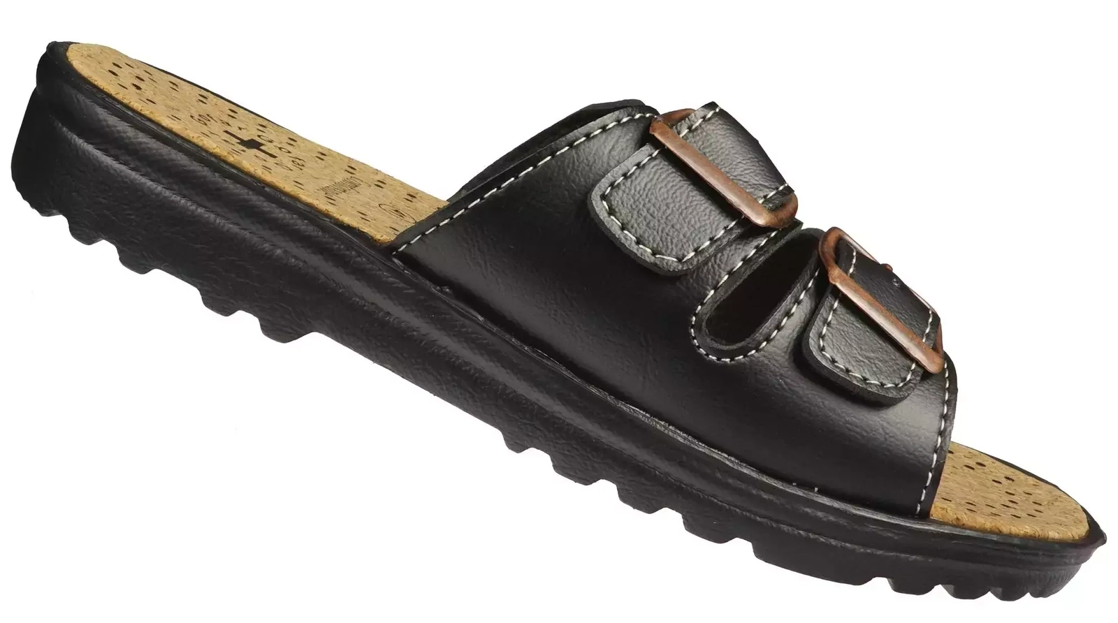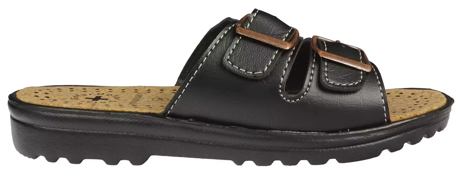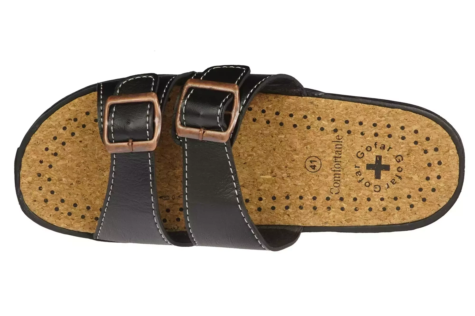 Klapki męskie firmy Gofar w kolorze czarnym z ozdobnymi klamrami. Skóra ekologiczna z jakiej zostały stworzone zapewnia długotrwałość produktu jak i maksymalne komfort użytkowania. Model ten jest bardzo praktycznym rozwiązaniem dla osób ceniących sobie wygodę i praktyczność. Chropowata podeszwa z bieżnikiem zapobiega ślizganiu się i gwarantuje przyczepność do podłoża. Klamry urozmaicające prosty design nie tylko są elementem ozdobnym, ale również pozawalają na lepsze dopasowania klapka męskiego do stopy. Co więcej wnętrze stworzone z miękkiego korka odpowiada za prawidłowe ułożenie stopy podczas chodzenia i sprawia że model ten jest lekki i praktyczny. Męskie klapki z ekoskóry idealnie sprawdzą się do codziennego użytku w ciepłe dni, jak również uzupełnią bardziej eleganckie stylizacje.