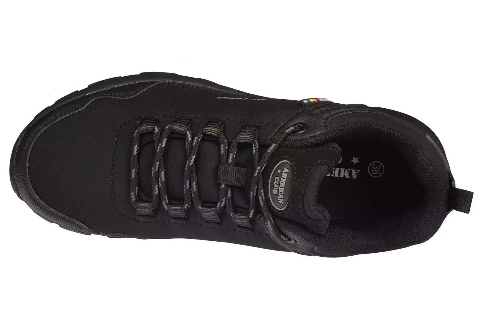 - Męskie buty sportowe Firmy American Club w kolorze czarnym. Posiadają cholewkę z materiału softshell który chroni przed wiatrem oraz deszczem. Obuwie jest wiązane, lekkie, posiada sztywny zapiętek co gwarantuje wygodę.