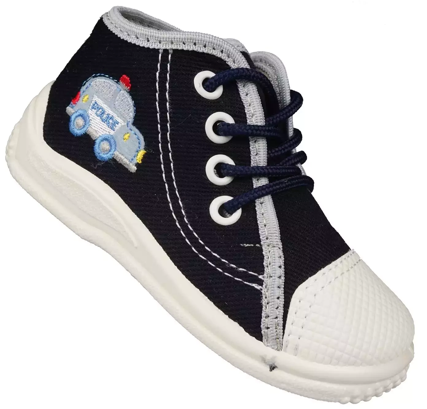 Tenisówki dziecięce firmy ZETPOL w granatowym kolorze naszytą grafiką samochodu policyjnego na boku. Buciki wykonane z materiałów tekstylnych wysokiej jakości. Posiadają skórzaną wkładkę która jest wzbogacona o aktywny węgiel pochłaniający nieprzyjemne zapachy oraz dziurki poprawiające wentylację i zapobiegające nadmiernemu poceniu się stopy. Staranne wykonanie, nowoczesne wzornictwo, a przede wszystkim wygoda i komfort dla dziecka - to cel firmy Zetpol. Obuwie posiada certyfikat C.L.P.O "Dobre Buty". Tenisówki zostały wykonane solidnie, maja usztywnioną piętę, elastyczne podeszwy są lekkie i wykonane ergonomicznie. Wysoka jakość obuwia gwarantuje trwałość oraz wygodę użytkowania. Idealne obuwie do przedszkola czy szkoły.