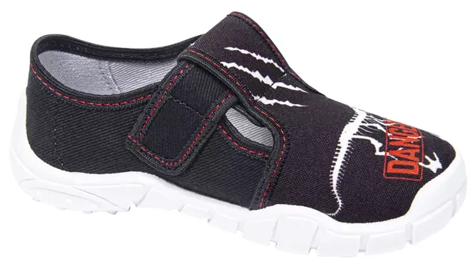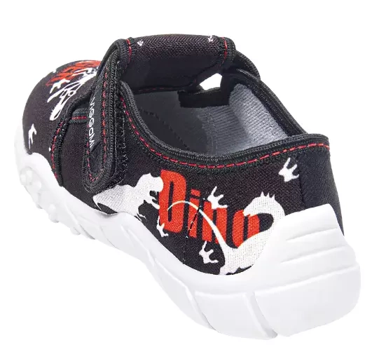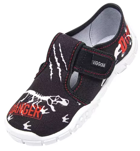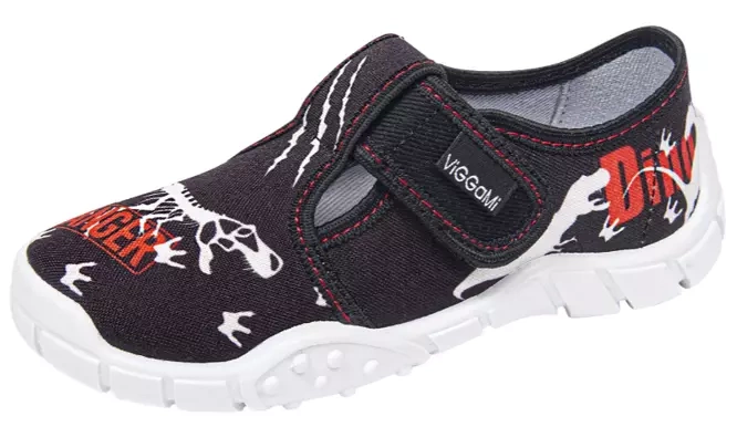 - Tenisówki dziecięce Viggami w czarnym kolorze z ciekawym wzorkiem dinozaura. Kapcie są zapinanie na rzep co znacznie ułatwia samodzielne zakładanie obuwia przez dziecko. Posiadają certyfikat zdrowej stopy.